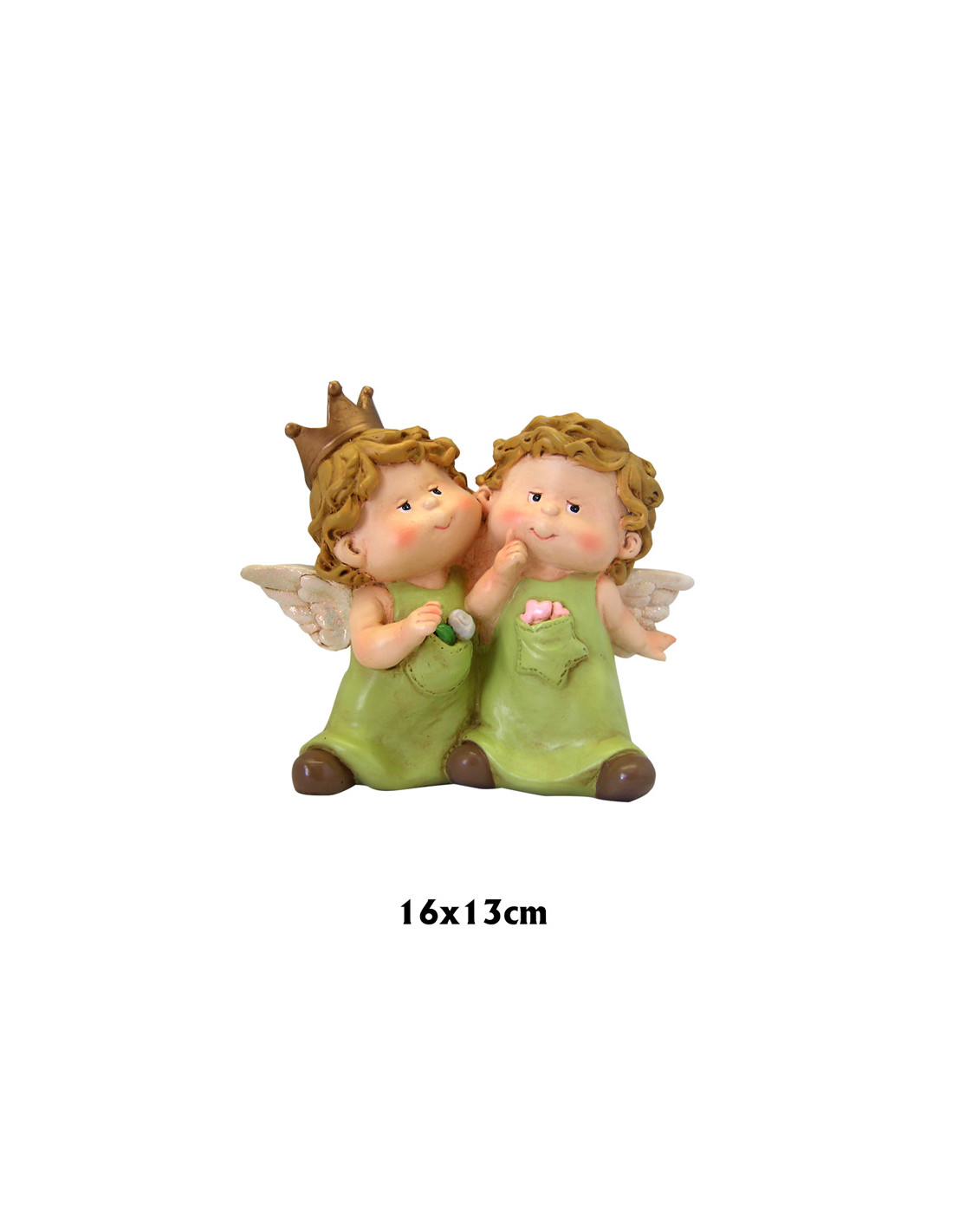 Dos Angelitos Niños 16X13cm Juntos De Pie Con Corona Y Tunicas Verdes