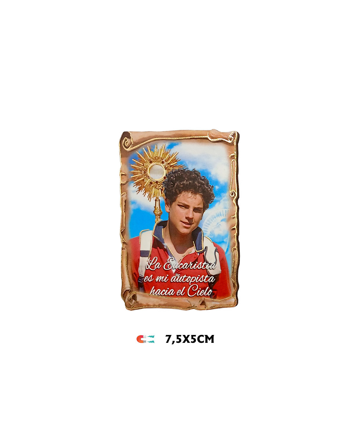 Imán con imagen de Carlo Acutis en forma de pergamino, hecho de resina y montado sobre MDF. Mide 60x40 mm, pensado para colocarse en superficies metálicas. Tu adolescentes lo pueden ver cada vez que abran la nevera, ¡que no son pocas veces!