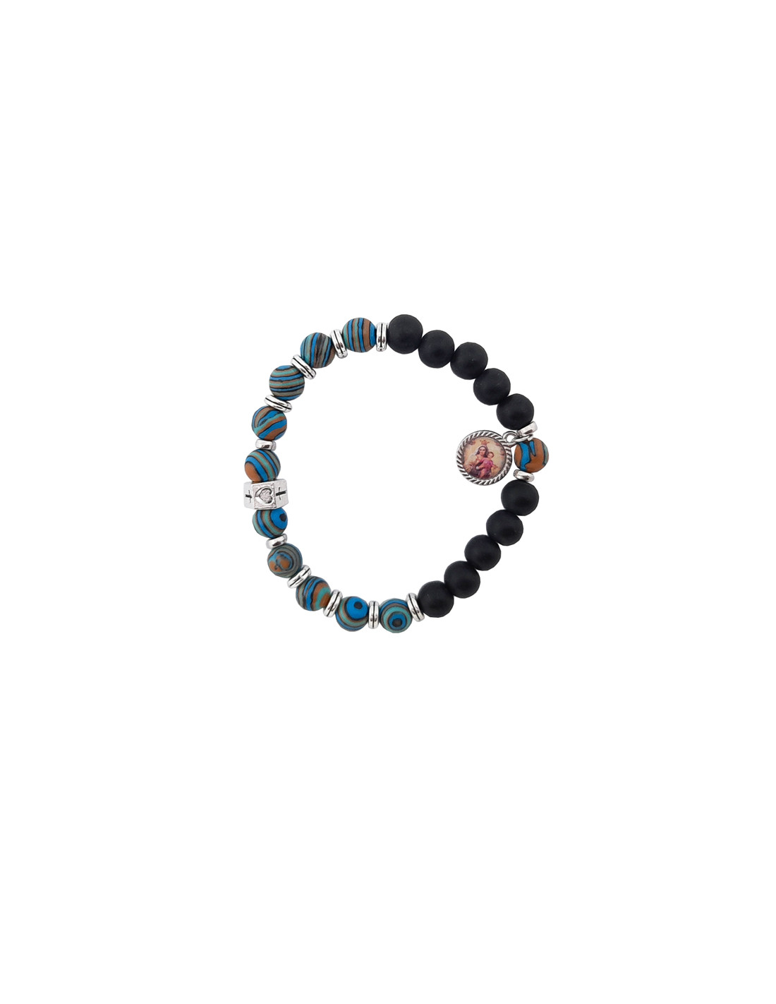 Pulsera Piedras Color Etnico Azul Y Blanco Con Bolas Negras Y Adorno Metal