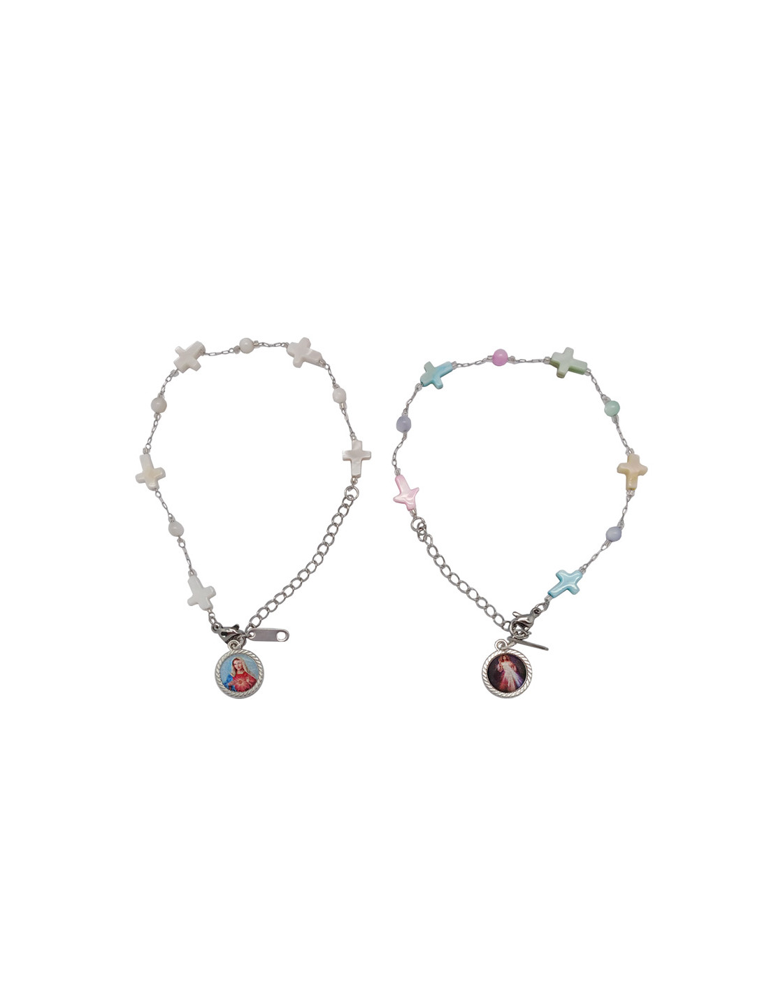 Pulsera Acero Blanco Eslabones Con Cruces De Nacar Con Bolitas