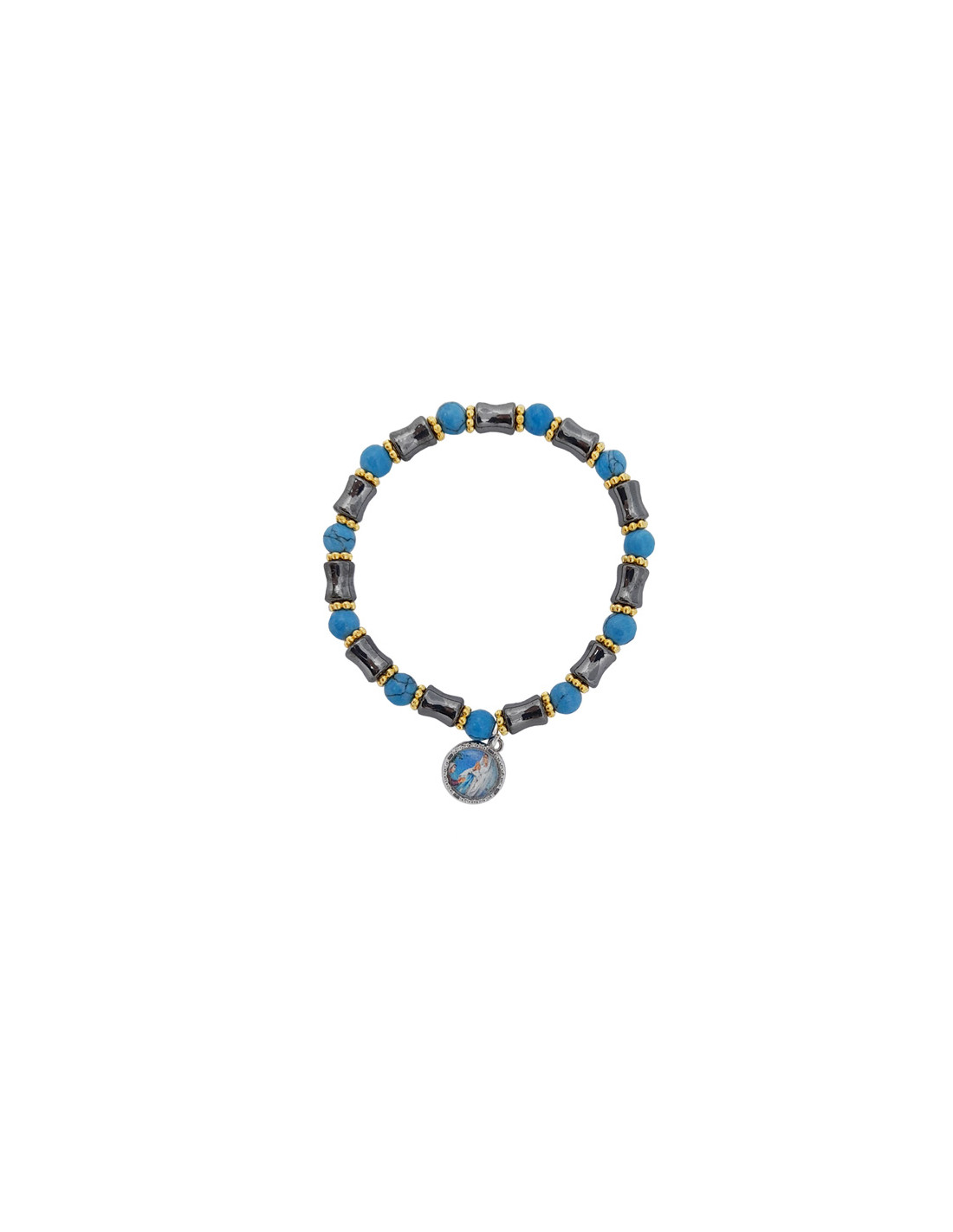 Pulsera Elastica Hematite Tubo Alternado Con Turquesa 5Mm Y Discos Dorados