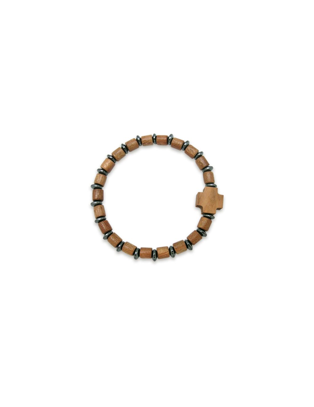 Pulsera Madera Ajustable Marron Cilindro Pequeño Adorno Metal Y Cruz Griega