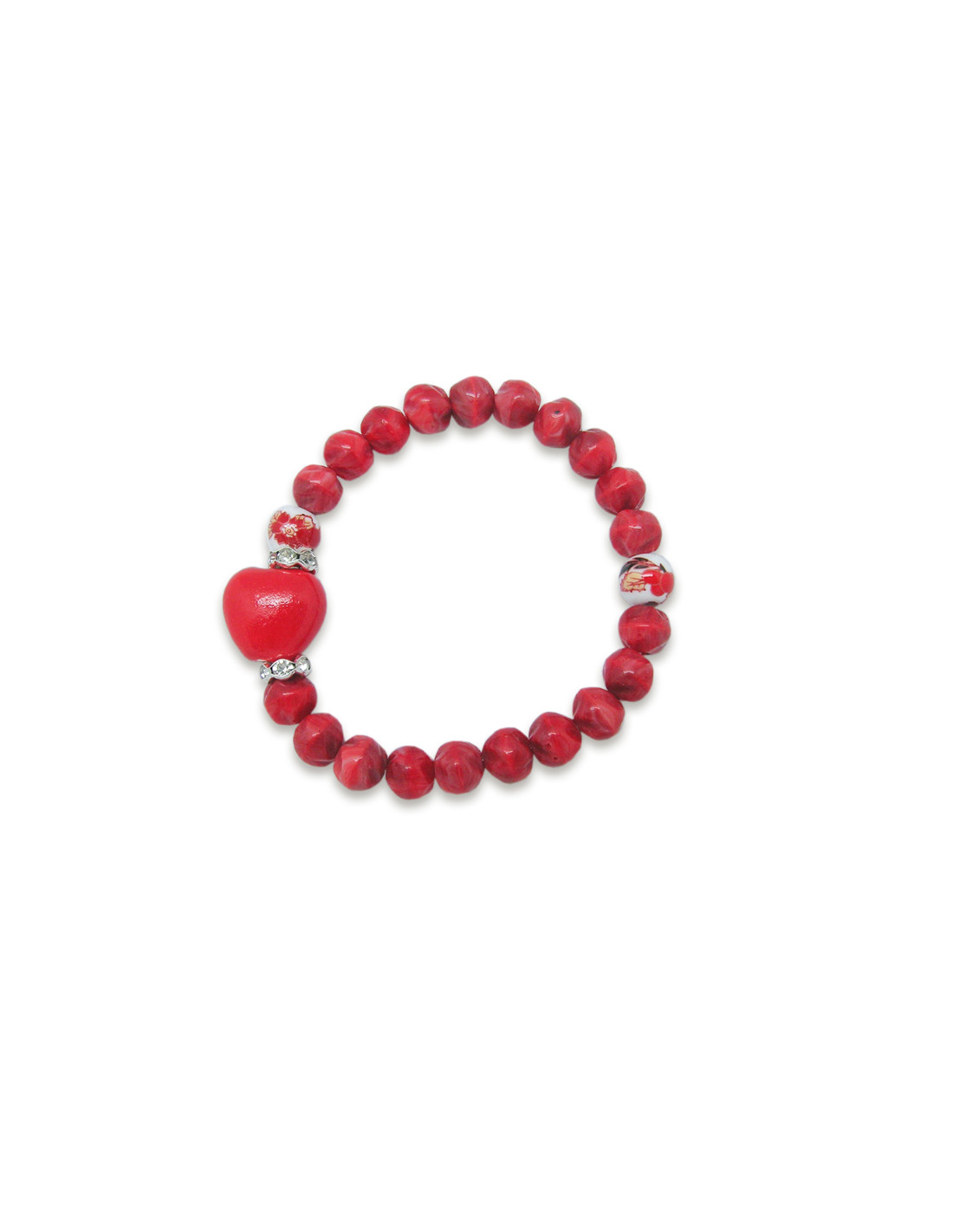 Pulsera Elastica Cristal Rojo 8Mm Con Corazon Y Dos Bolas Ceramica Para Personalizar