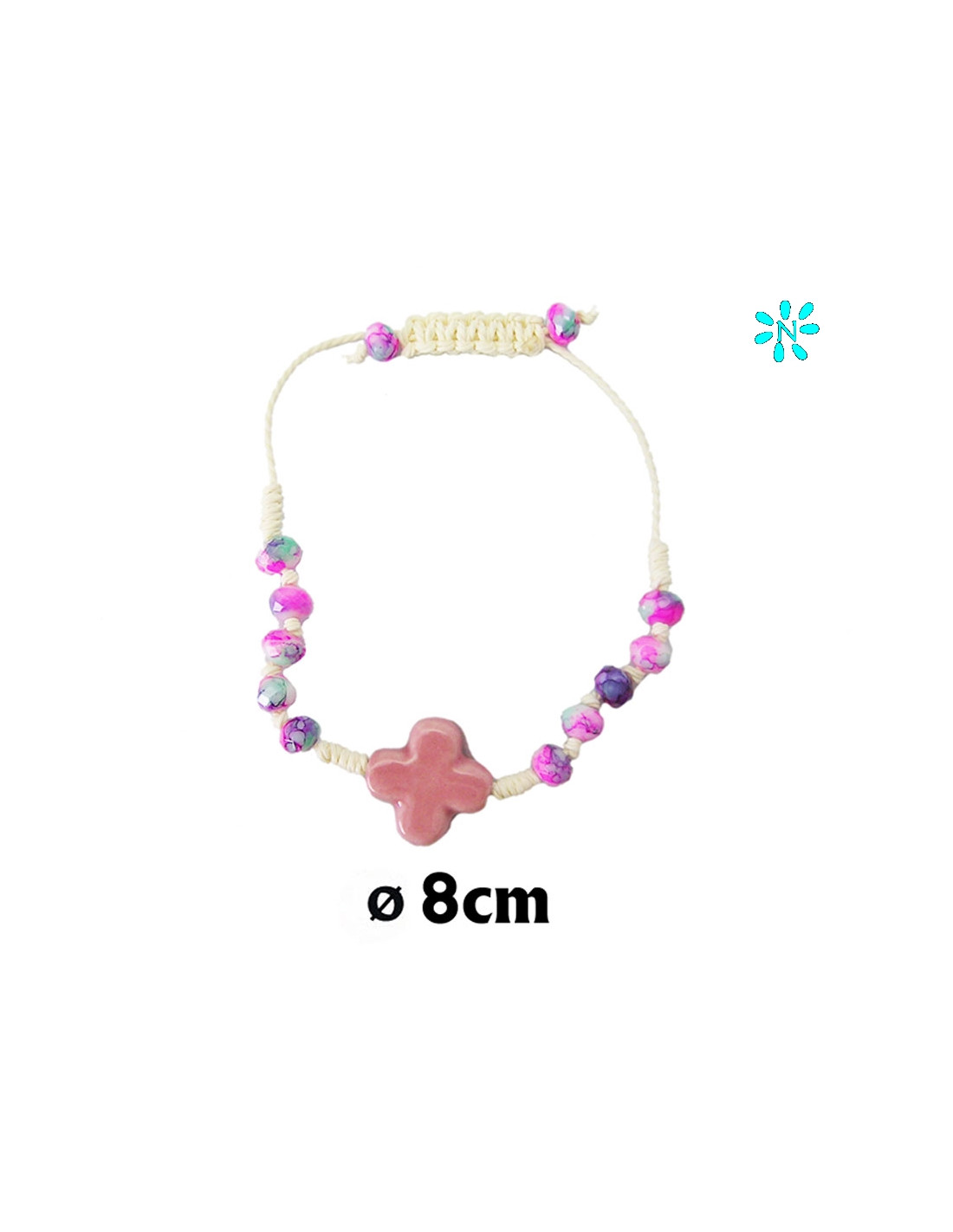 Pulsera Cuerda Con Bolas De Cristal Y Cruz Ceramica Rosa