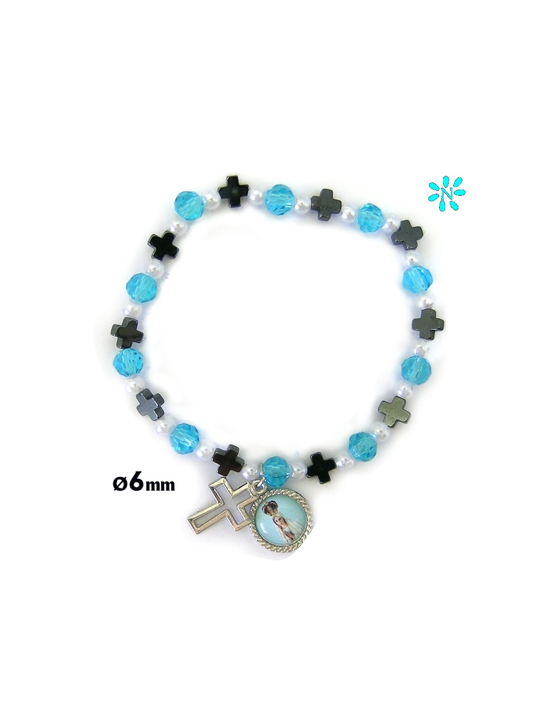 Pulsera Elastica Bola Cristal Azul Claro 6 Mm Con Cruces Hematite