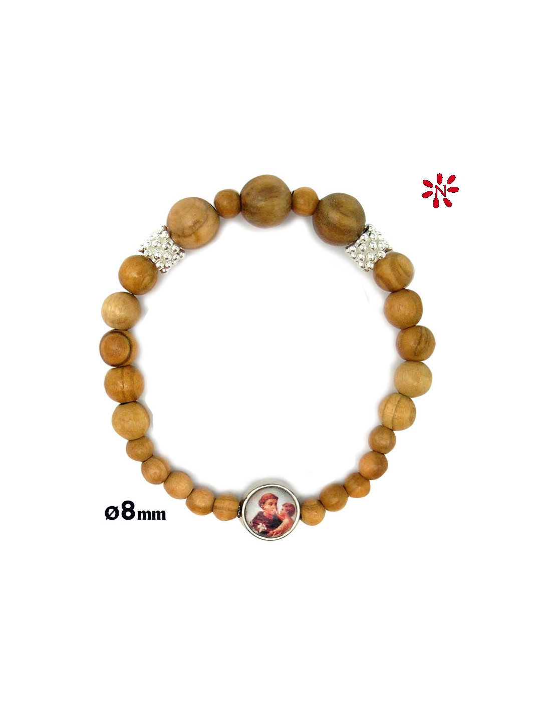Pulsera Madera Olivo Bola Lisa 8Mm Dos Apliques Brillo