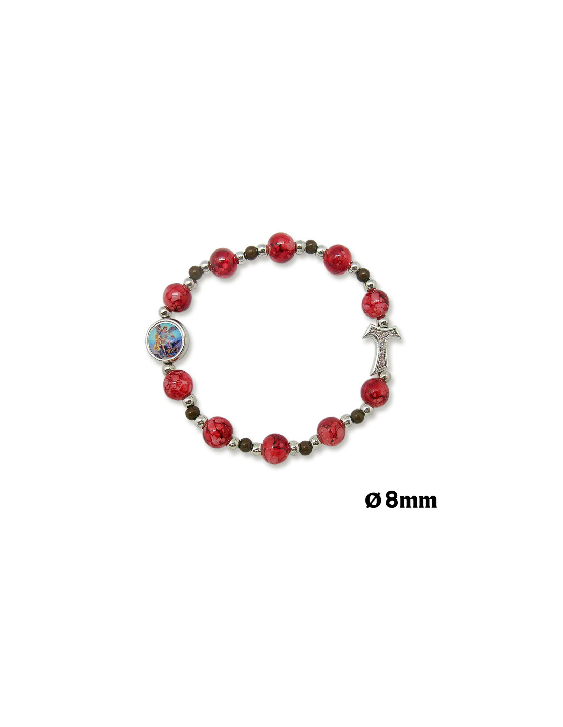 Pulsera Brazalete Elastica 8Mm Cristal Rojo Y Blanco Con Tau Y Bolitas Madera