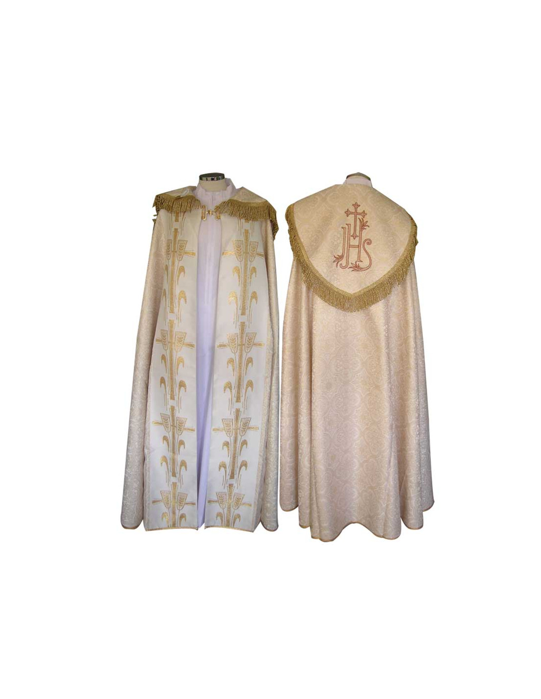 Capa Pluvial Estampada Blanca Tipo Damasco Espigas Y Bordado Jhs Detras Con Flecos Con Estola