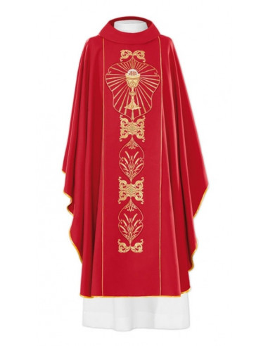 Casulla roja bordada con galón central, confeccionada en tejido de alta calidad, y ribeteada en dorado. Motivo central de un caliz forma dentro ornacina y greca espigas. Cuello redondo, con estola interior incluida. Últimas unidades. Confeccionada en la UE.