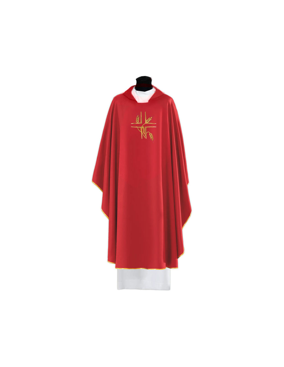 Casulla roja bordada con galón central, confeccionada en tejido de alta calidad, y ribeteada en dorado. Motivo central de una Cruz ancha y hueca por dentro con 3 espigas. Cuello abierto a la española, con estola interior incluida. Últimas unidades. Confeccionada en la UE.
