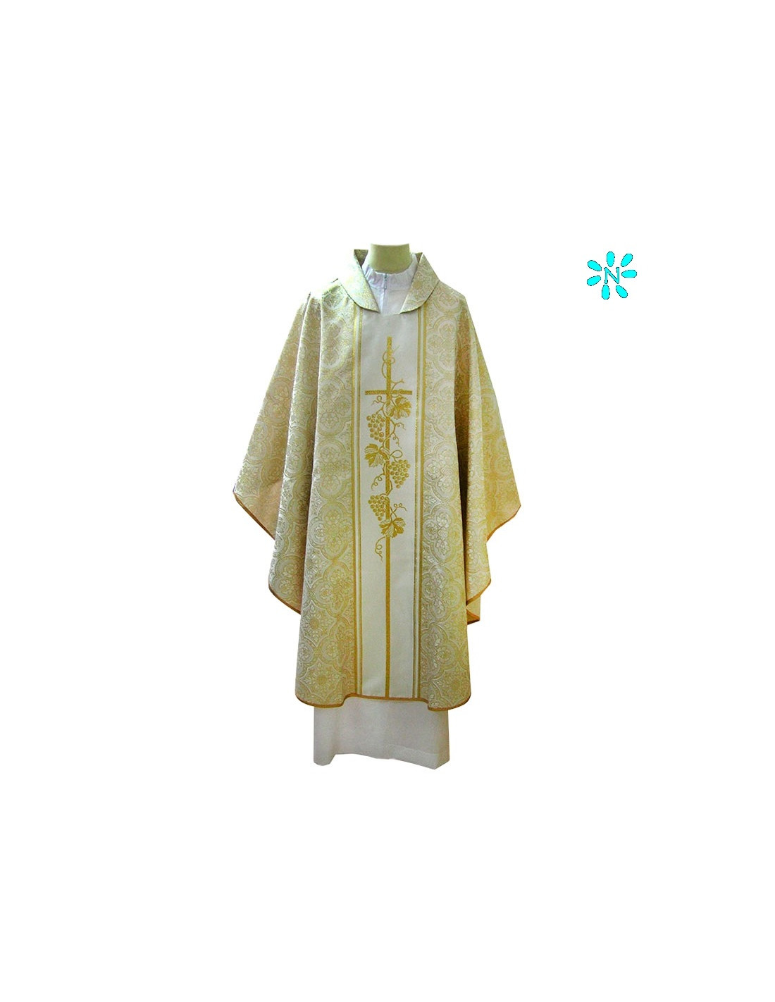 Casulla estampada Tipo Damasco, confeccionada en tejido liso de alta calidad. Motivo central de Cruz larga racimos uvas. Cuello abierto a la española, con estola interior incluida. Disponible en más colores litúrgicos. Confeccionada en la UE.