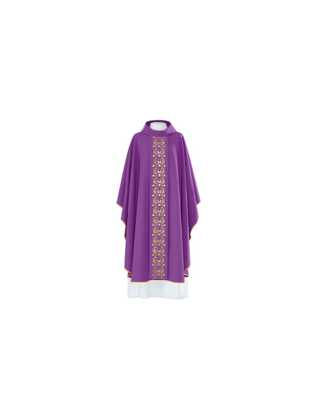Casulla morada bordada con galón central, confeccionada en tejido Kor/065 de alta calidad, y ribeteada en dorado. Motivo central de uvas en rectangulo. Cuello redondo, con estola interior incluida. Últimas unidades. Confeccionada en la UE.