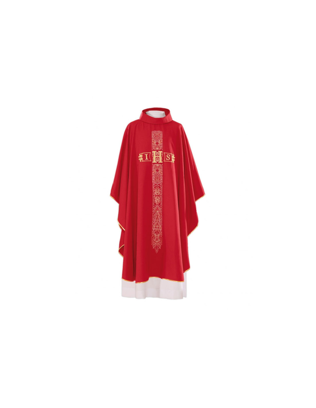 Casulla roja bordada con galón central, confeccionada en tejido Kor/051 de alta calidad, y ribeteada en dorado. Motivo central de Cruz larga con IHS al centro. Cuello redondo, con estola interior incluida. Últimas unidades. Confeccionada en la UE.