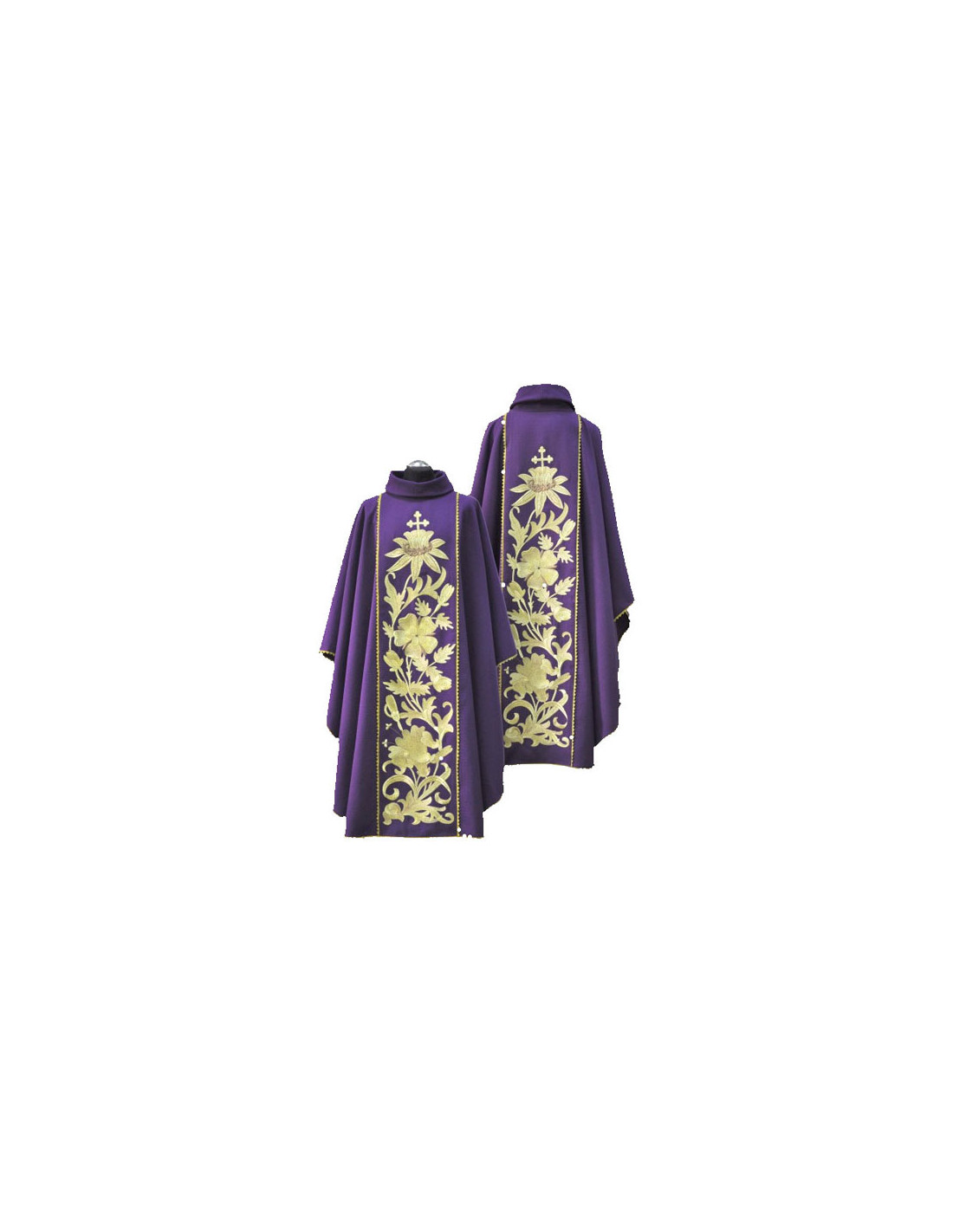 Casulla morada bordada con galón central, confeccionada en tejido Kor/034 de alta calidad, y ribeteada en dorado. Motivo central de adornos florales grandes Cruz superior. Cuello redondo, con estola interior incluida. Últimas unidades. Confeccionada en la UE.