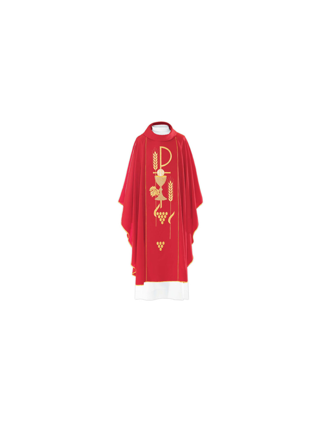 Casulla roja bordada con galón central, confeccionada en tejido Kor/001 de alta calidad, y ribeteada en dorado. Motivo central de PAX caliz forma espigas y uvas. Cuello redondo, con estola interior incluida. Últimas unidades. Confeccionada en la UE.