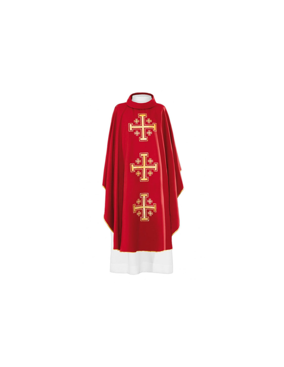 Casulla roja bordada con galón central, confeccionada en tejido de alta calidad, y ribeteada en dorado. Motivo central de tres cruces de Jerusalén. Cuello redondo, con estola interior incluida. Últimas unidades. Confeccionada en la UE.