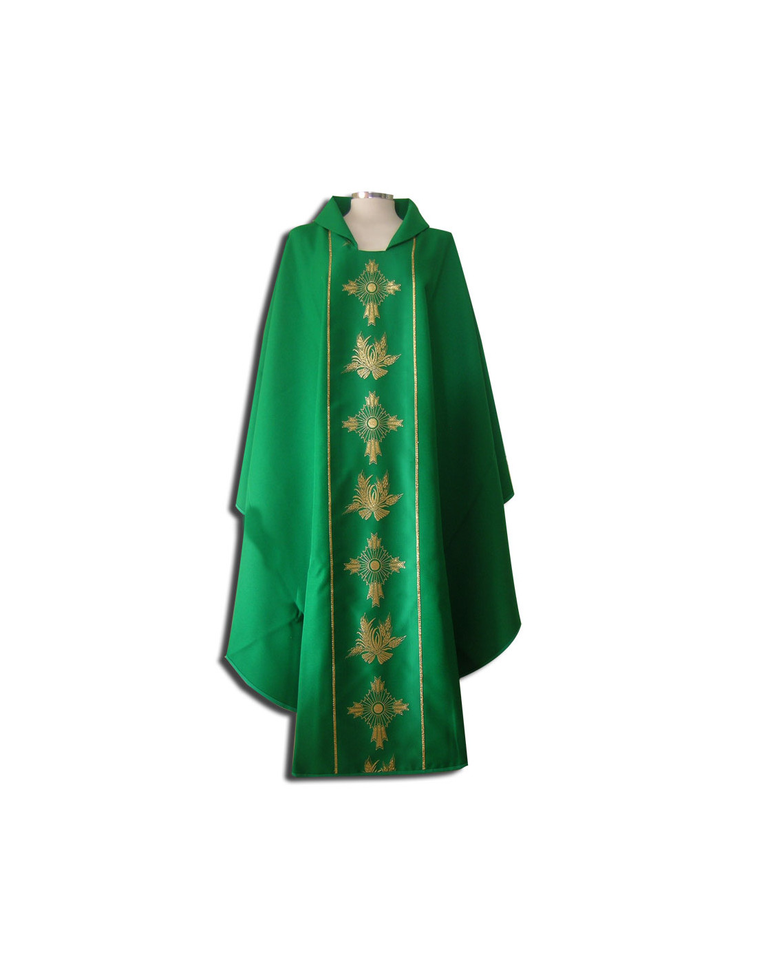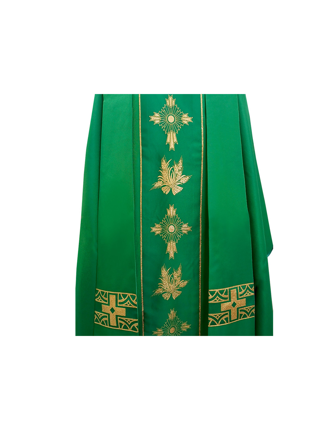 Casulla verde estampada con galón central, confeccionada en tejido liso de alta calidad, y ribeteada en dorado. Motivo central de Cruz y espigas doradas. Cuello abierto a la española, con estola interior incluida. Disponible en todos los colores litúrgicos. Confeccionada en la UE.