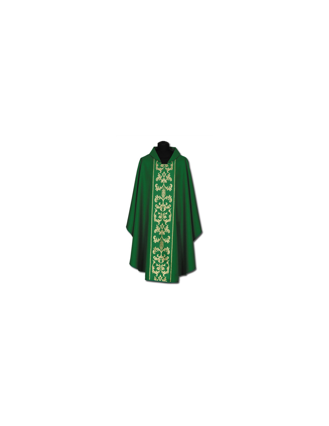 Casulla verde estampada con galón central, confeccionada en tejido liso de alta calidad, y ribeteada en dorado. Motivo central de espiga tipo Lis dorada. Cuello abierto a la española, con estola interior incluida. Disponible en todos los colores litúrgicos. Confeccionada en la UE.