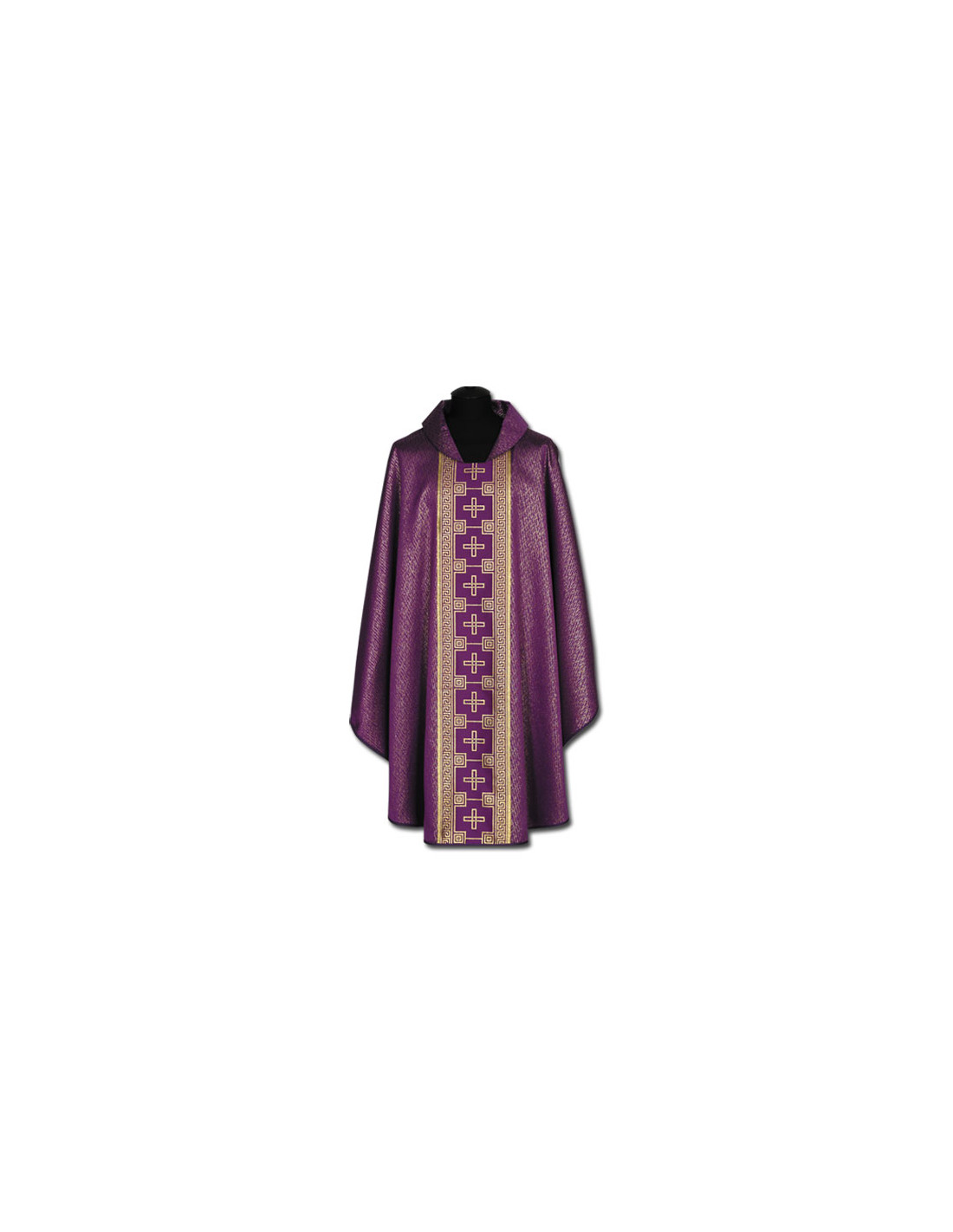 Casulla morada estampada Tipo Damasco, confeccionada en tejido liso de alta calidad. Motivo central de Greca Romana. Cuello abierto a la española, con estola interior incluida. Disponible en más colores litúrgicos. Confeccionada en la UE.