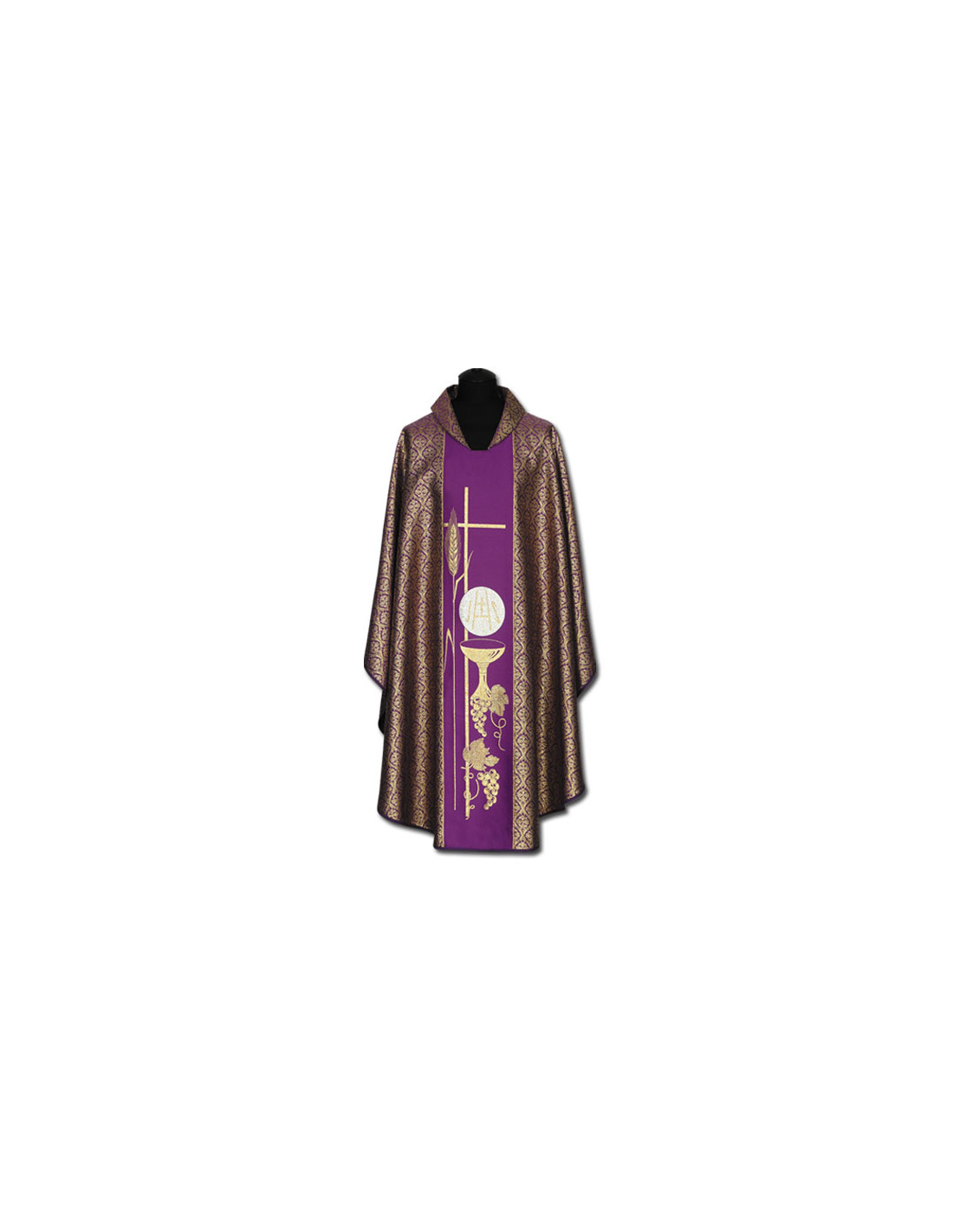 Casulla Estampada Tipo Damasco Con Galon Cruz Y Espiga Fina Caliz Y Forma N375 Morada
