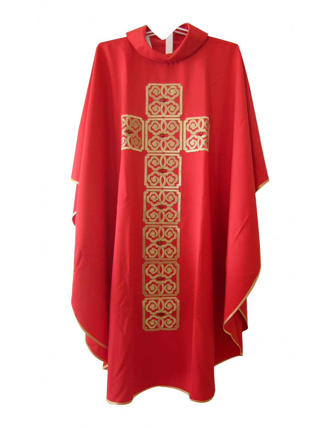 Casulla roja bordada con galón central, confeccionada en tejido Kor/079 de alta calidad, y ribeteada en dorado. Motivo central de tela rejilla Cruz larga a cuadrados con piedrecitas. Cuello redondo, con estola interior incluida. Últimas unidades. Confeccionada en la UE.