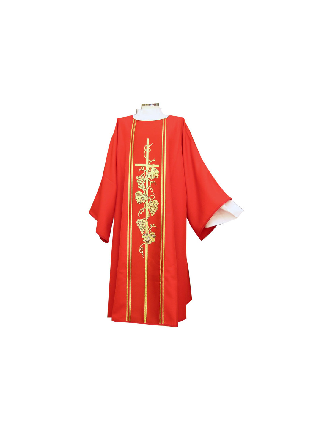 Dalmática estampada, confeccionada en tejido liso de alta calidad. Motivo central de Cruz larga con racimos. Cuello redondo. Disponible en más colores litúrgicos. Confeccionada en la UE.