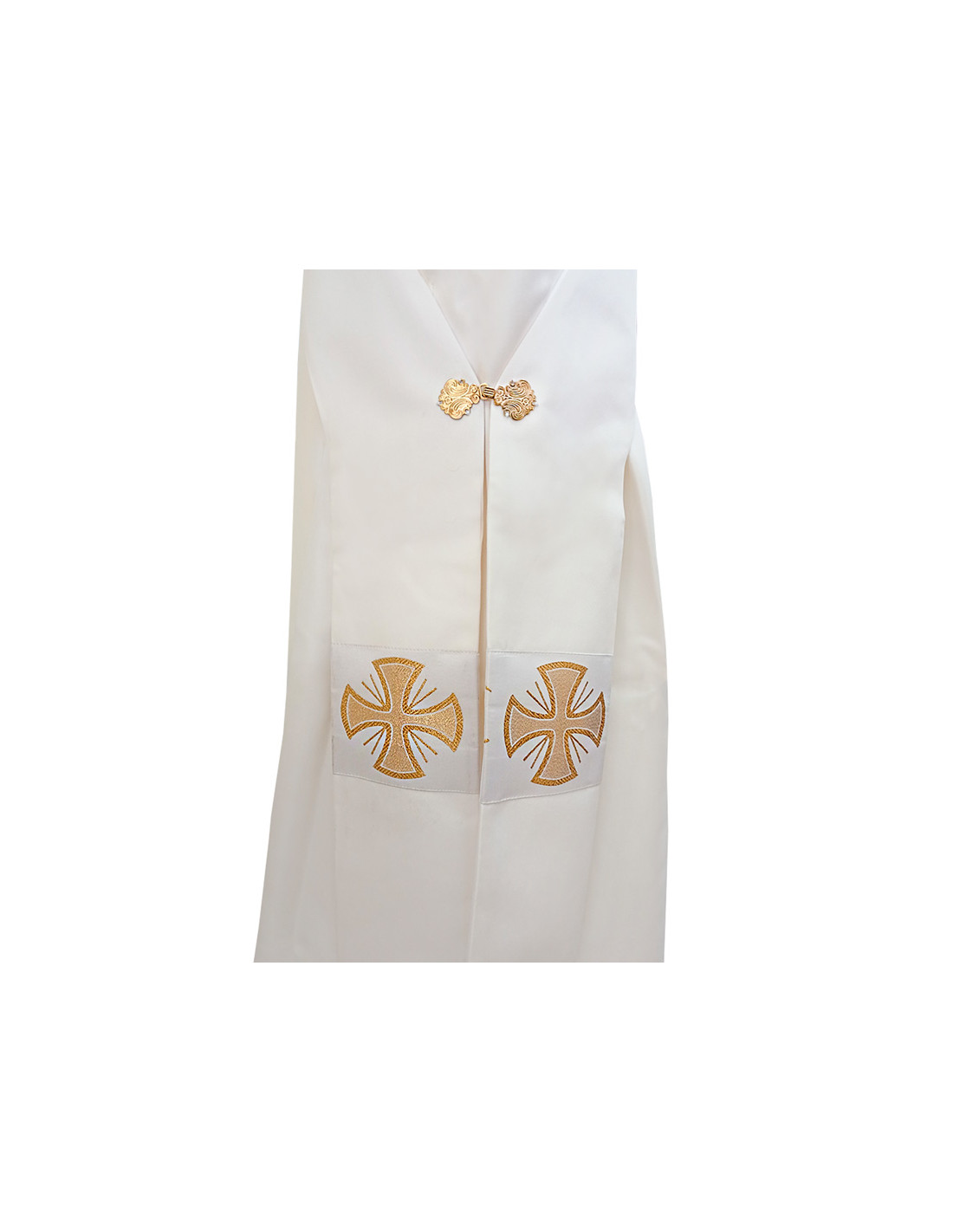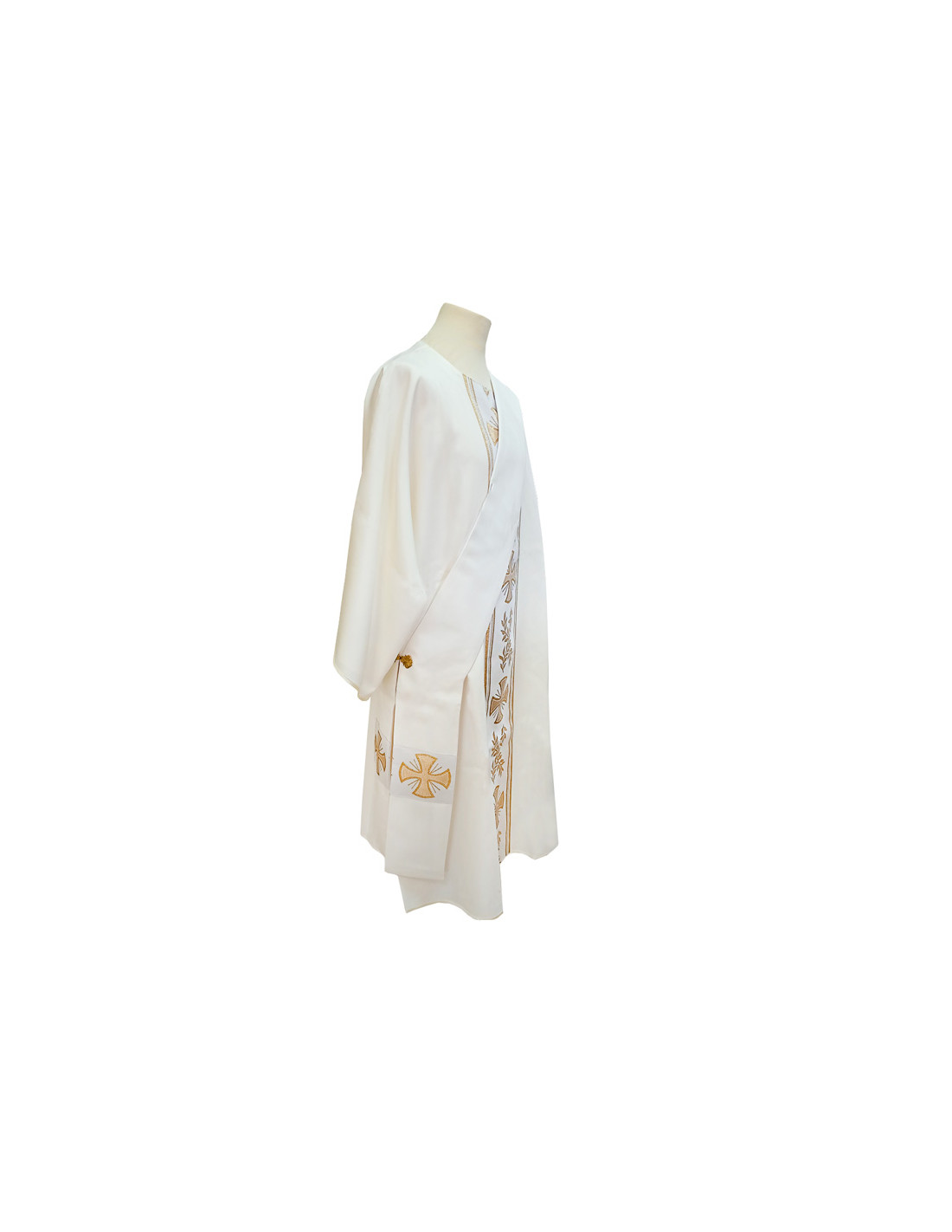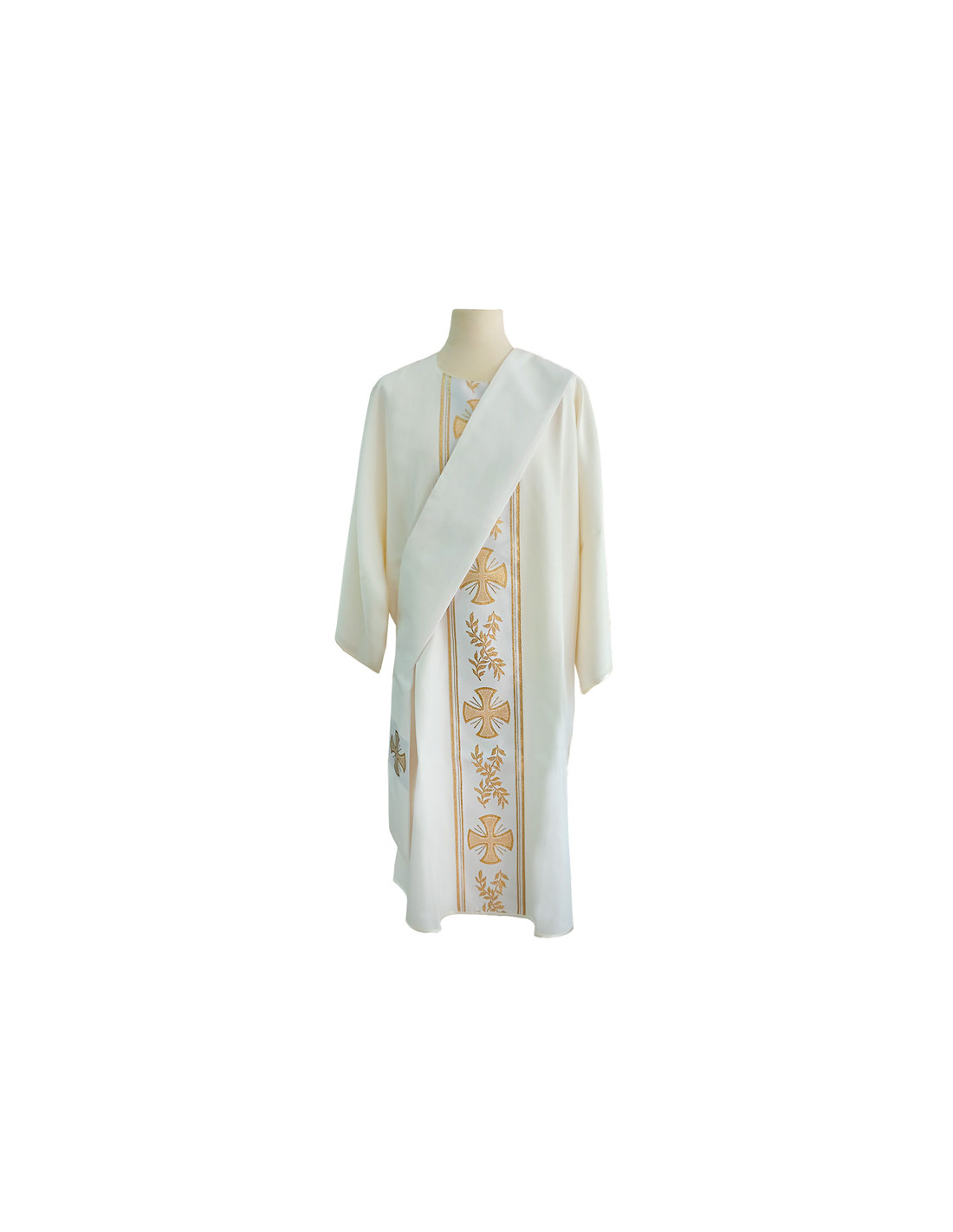 Dalmática estampada, confeccionada en tejido liso de alta calidad. Motivo central de cruces largas dentro de ornacinas. Cuello redondo. Disponible en más colores litúrgicos. Confeccionada en la UE.