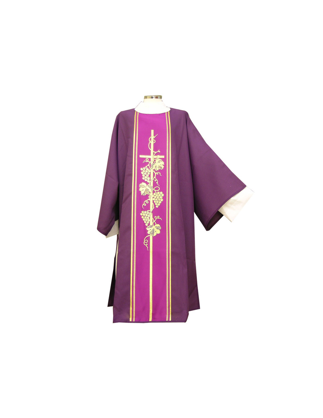 Dalmática estampada, confeccionada en tejido liso de alta calidad. Motivo central de Cruz larga con racimos. Cuello redondo. Disponible en más colores litúrgicos. Confeccionada en la UE.