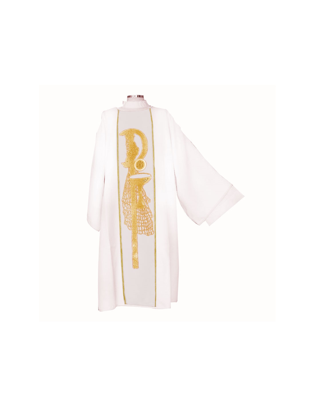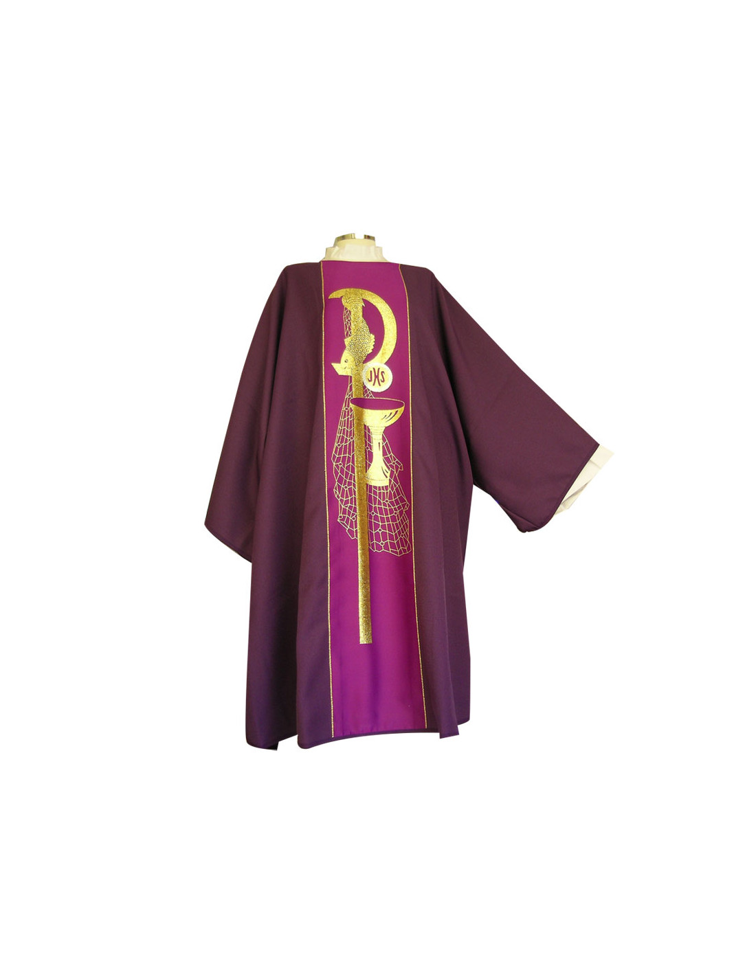 Dalmática estampada, confeccionada en tejido liso de alta calidad. Motivo central de PAX caliz forma y una red de fondo. Cuello redondo. Disponible en más colores litúrgicos. Confeccionada en la UE.