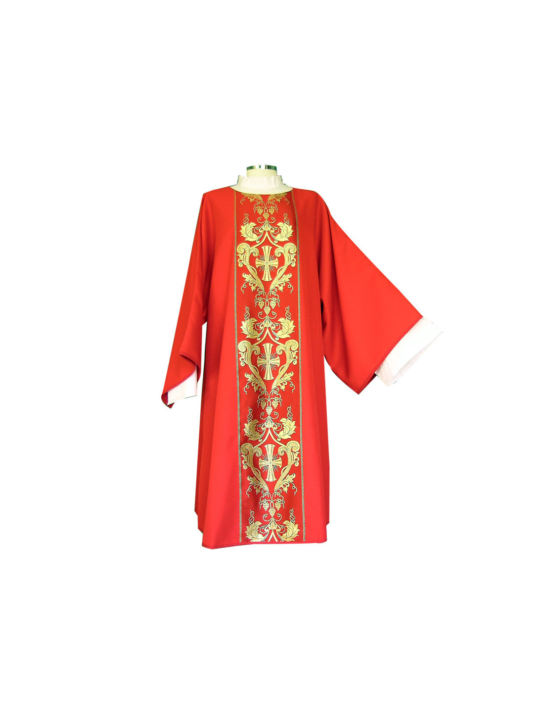 Dalmática estampada, confeccionada en tejido liso de alta calidad. Motivo central de cruces largas dentro de ornacinas. Cuello redondo. Disponible en más colores litúrgicos. Confeccionada en la UE.
