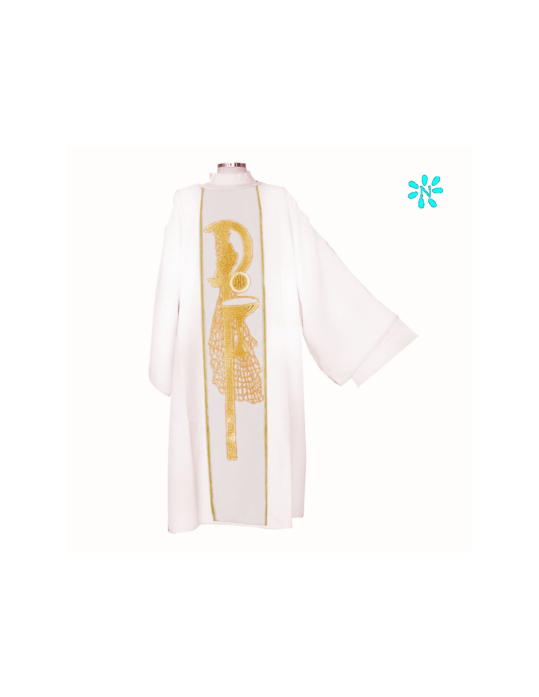 Dalmática estampada, confeccionada en tejido liso de alta calidad. Motivo central de PAX caliz forma y una red de fondo. Cuello redondo. Disponible en más colores litúrgicos. Confeccionada en la UE.