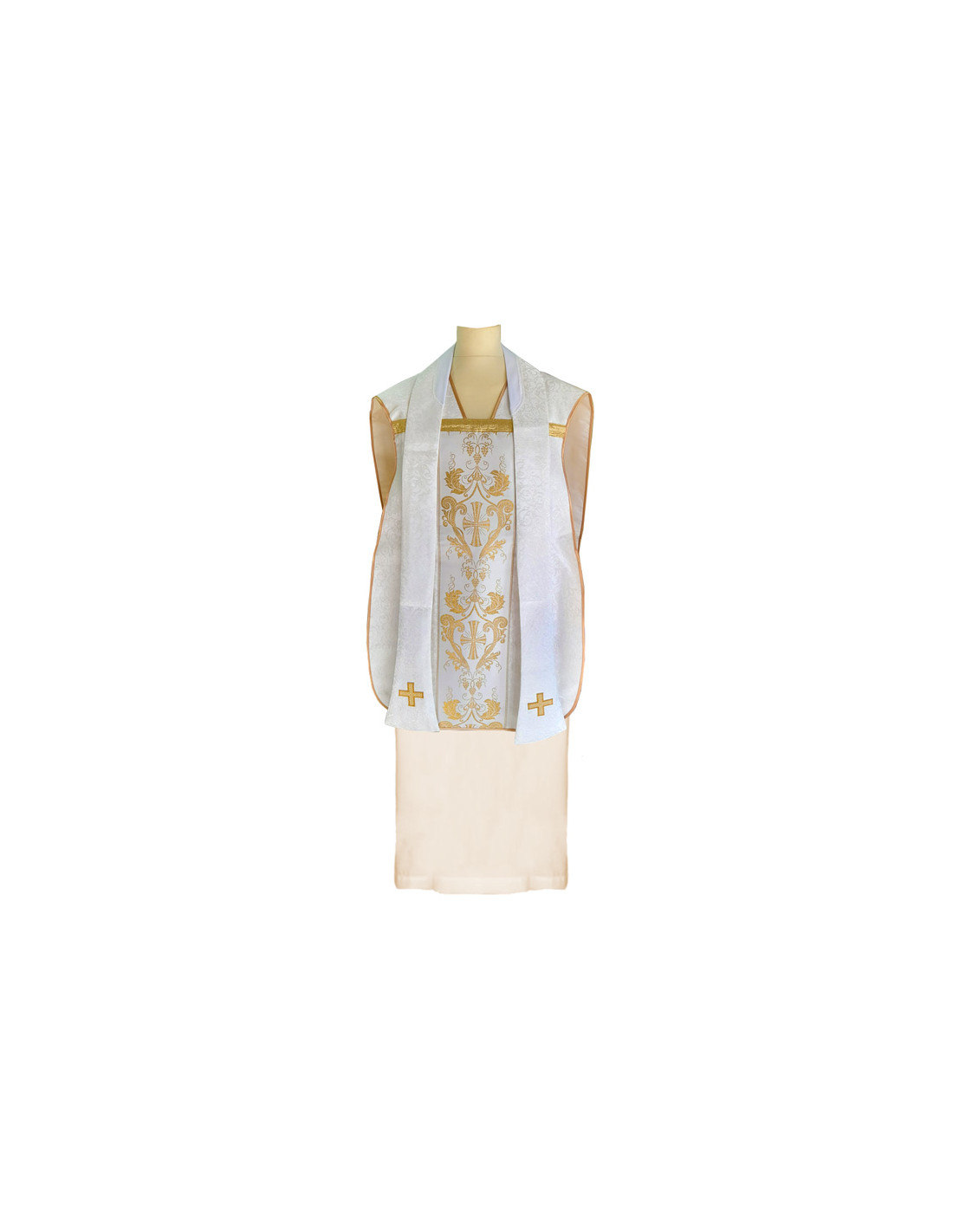 Casulla tipo guitarra estampada con galón central, confeccionada en tejido liso de alta calidad, y ribeteada en dorado. Motivo central de Cruz dentro ornacina tela tipo damasco. Con estola interior incluida. Disponible en más colores litúrgicos. Confeccionada en la UE.