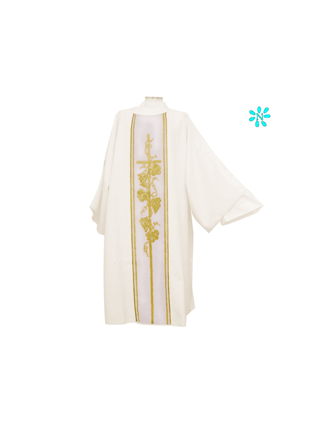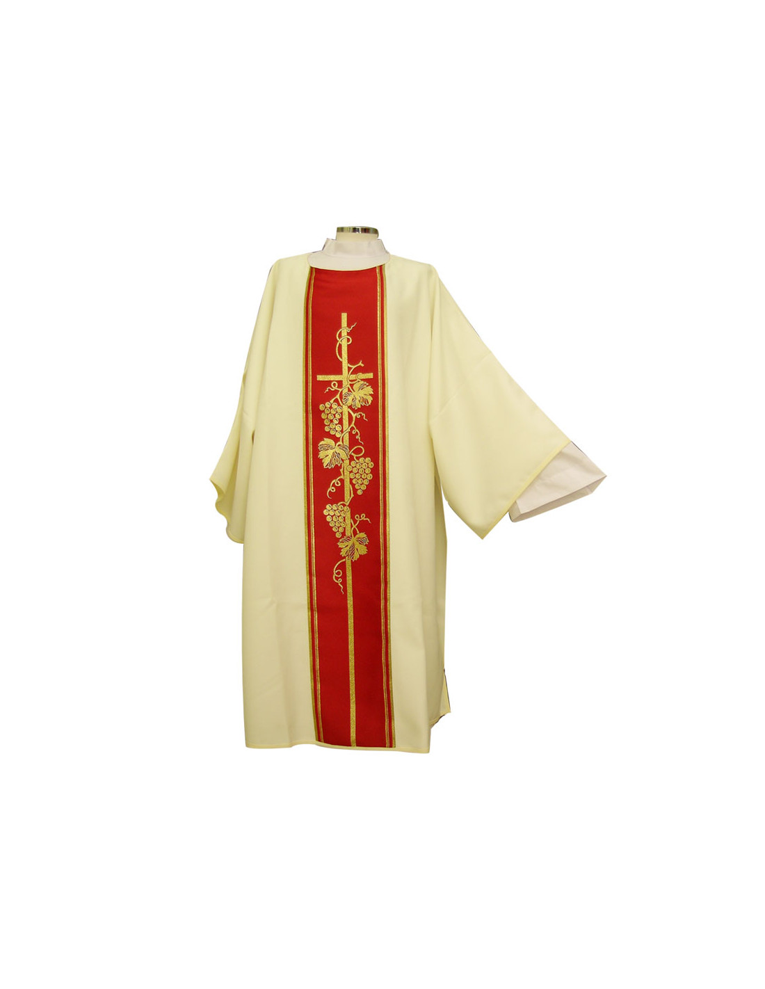 Dalmática estampada, confeccionada en tejido liso de alta calidad. Motivo central de Cruz larga con racimos. Cuello redondo. Disponible en más colores litúrgicos. Confeccionada en la UE.
