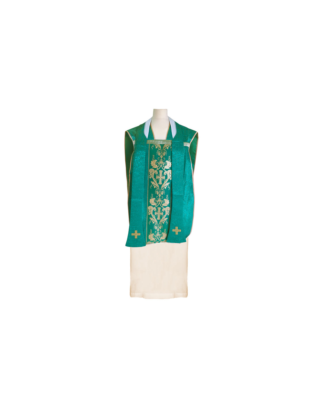 Casulla tipo guitarra verde estampada con galón central, confeccionada en tejido liso de alta calidad, y ribeteada en dorado. Motivo central de Cruz dentro ornacina tela tipo damasco. Con estola interior incluida. Disponible en más colores litúrgicos. Confeccionada en la UE.