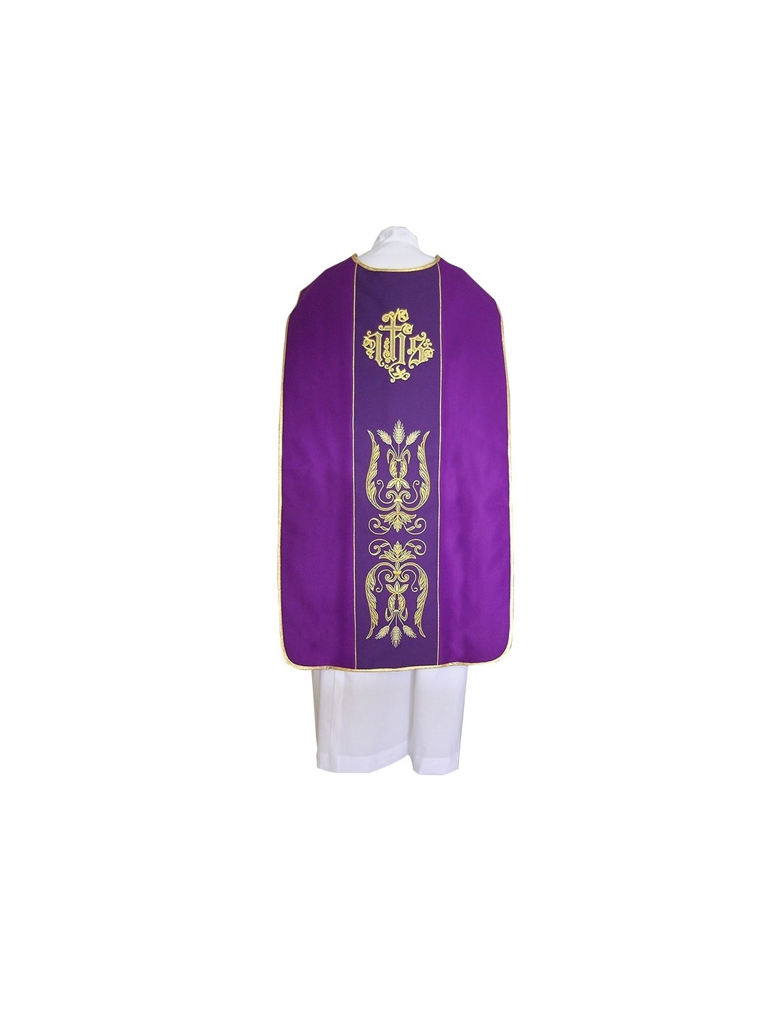 Casulla morada Tipo Guitarra bordada con galón central, confeccionada en tejido liso de alta calidad, y ribeteada en dorado. Motivo central de decoracion floral. Con estola interior incluida. Disponible en todos los colores litúrgicos. Confeccionada en la UE.