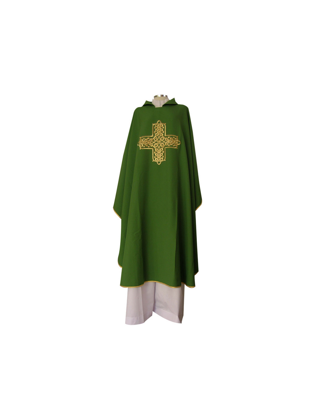 Casulla verde bordada con galón central, confeccionada en tejido Kor/172 de alta calidad, y ribeteada en dorado. Motivo central de Cruz ancha tipo griega entrelazado interno. Cuello redondo, con estola interior incluida. Últimas unidades. Confeccionada en la UE.