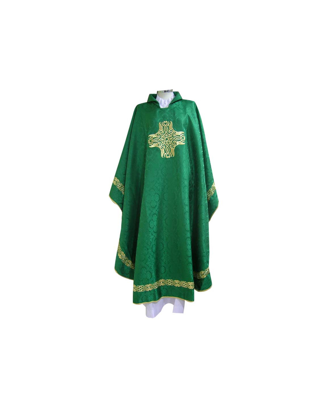 Casulla morada bordada con galón central, confeccionada con tela adamascada, bordado de contorno exterior y ribeteada en dorado. Motivo central de una Cruz cuadrada. Cuello redondo, con estola interior incluida. Últimas unidades. Confeccionada en la UE.