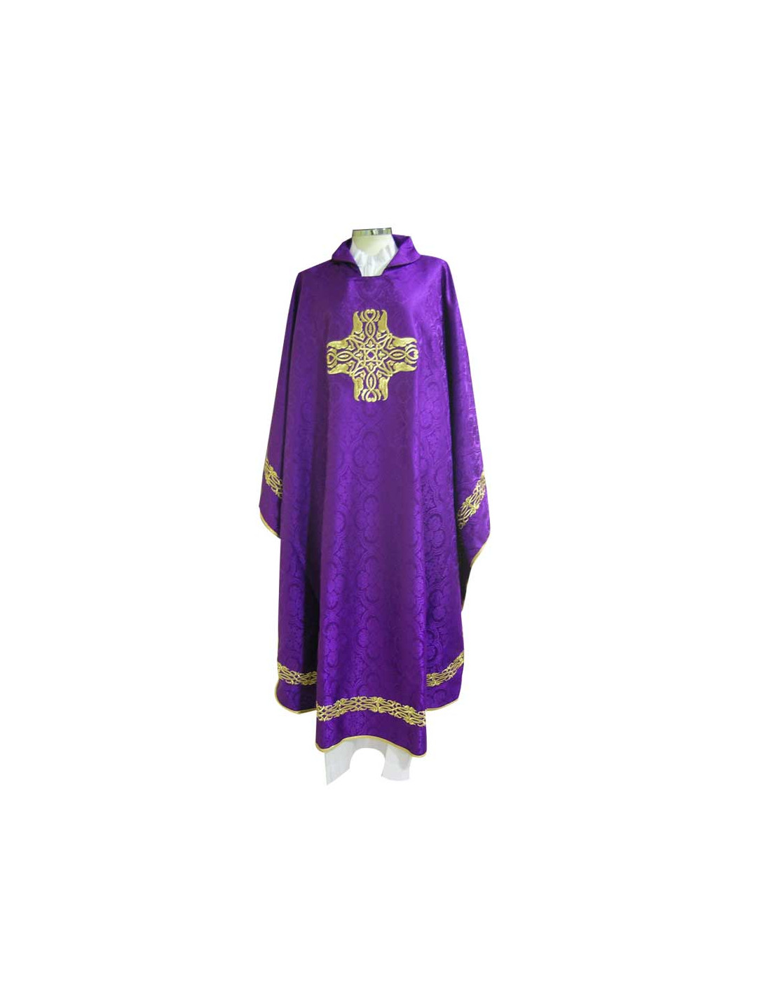 Casulla morada bordada con galón central, confeccionada con tela adamascada, bordado de contorno exterior y ribeteada en dorado. Motivo central de una Cruz cuadrada. Cuello redondo, con estola interior incluida. Últimas unidades. Confeccionada en la UE.