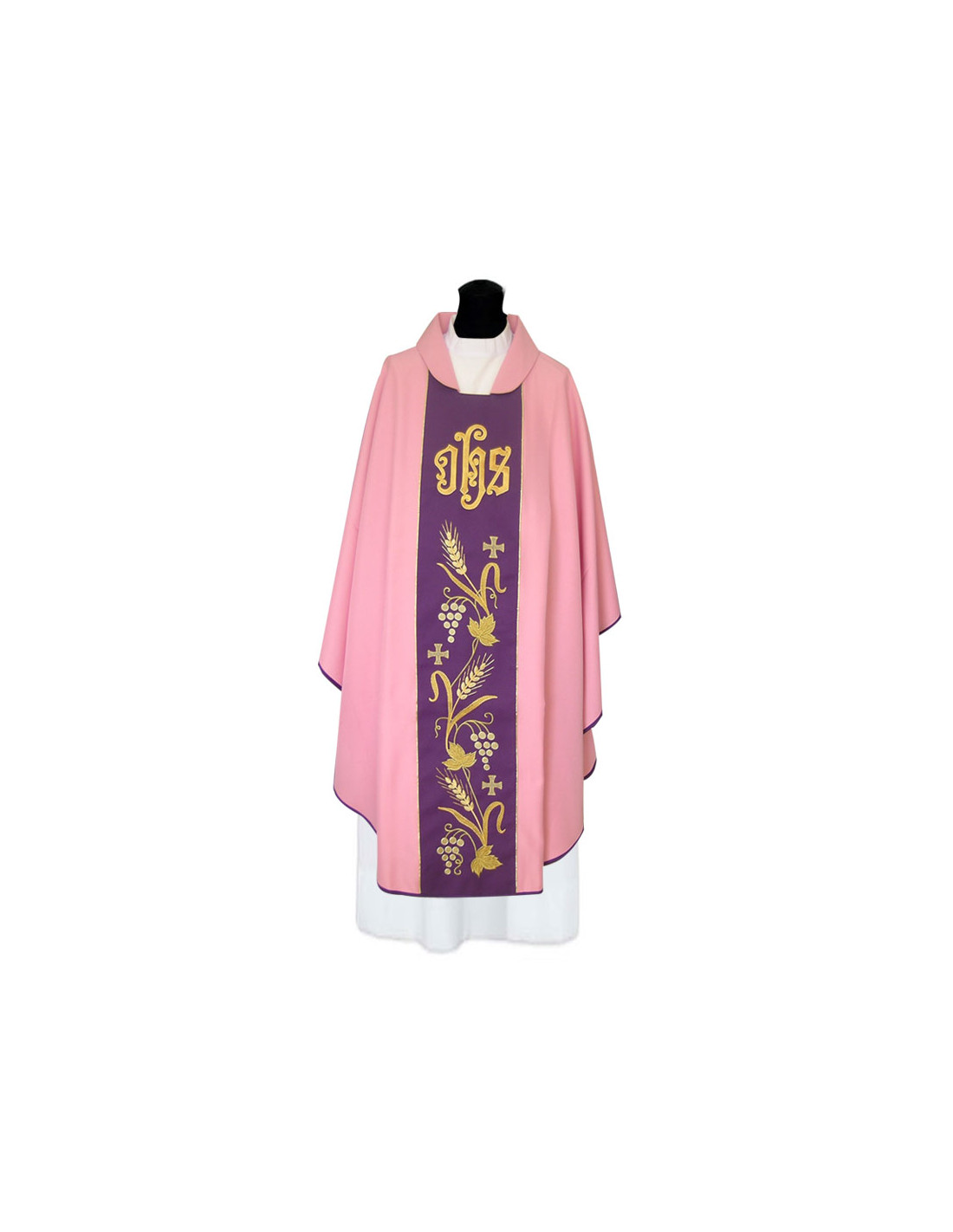 Casulla rosa bordada lisa con galón central, confeccionada en tejido de alta calidad, y ribeteada en dorado. Motivo central de JHS y espigas con uva y cruces pequeñas. Cuello abierto a la española, con estola interior incluida. Disponible en más colores litúrgicos. Confeccionada en la UE.