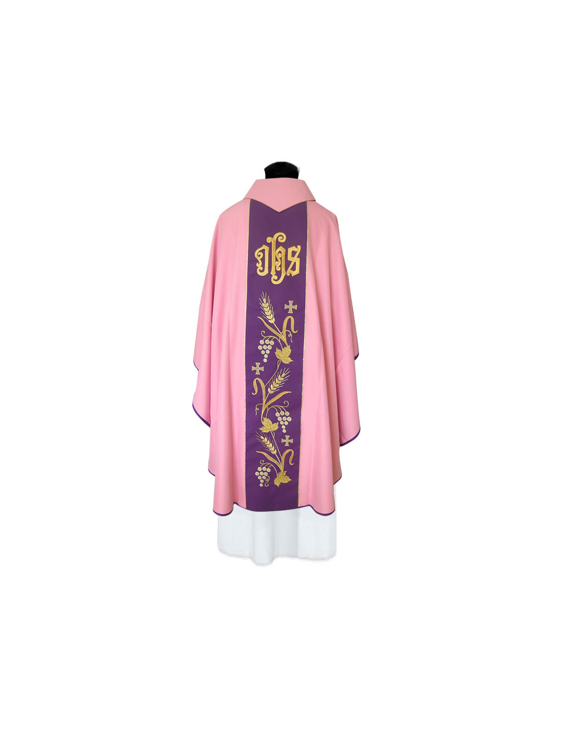 Casulla rosa bordada lisa con galón central, confeccionada en tejido de alta calidad, y ribeteada en dorado. Motivo central de JHS y espigas con uva y cruces pequeñas. Cuello abierto a la española, con estola interior incluida. Disponible en más colores litúrgicos. Confeccionada en la UE.