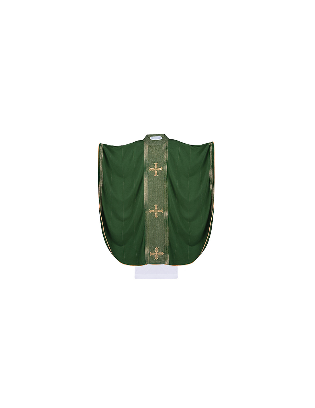 Casulla verde bordada con galón central, confeccionada en tejido de alta calidad, y ribeteada en dorado. Motivo central de 3 cruces de flor en tela rayada. Cuello redondo, con estola interior incluida. Disponible en más colores litúrgicos. Confeccionada en la UE.