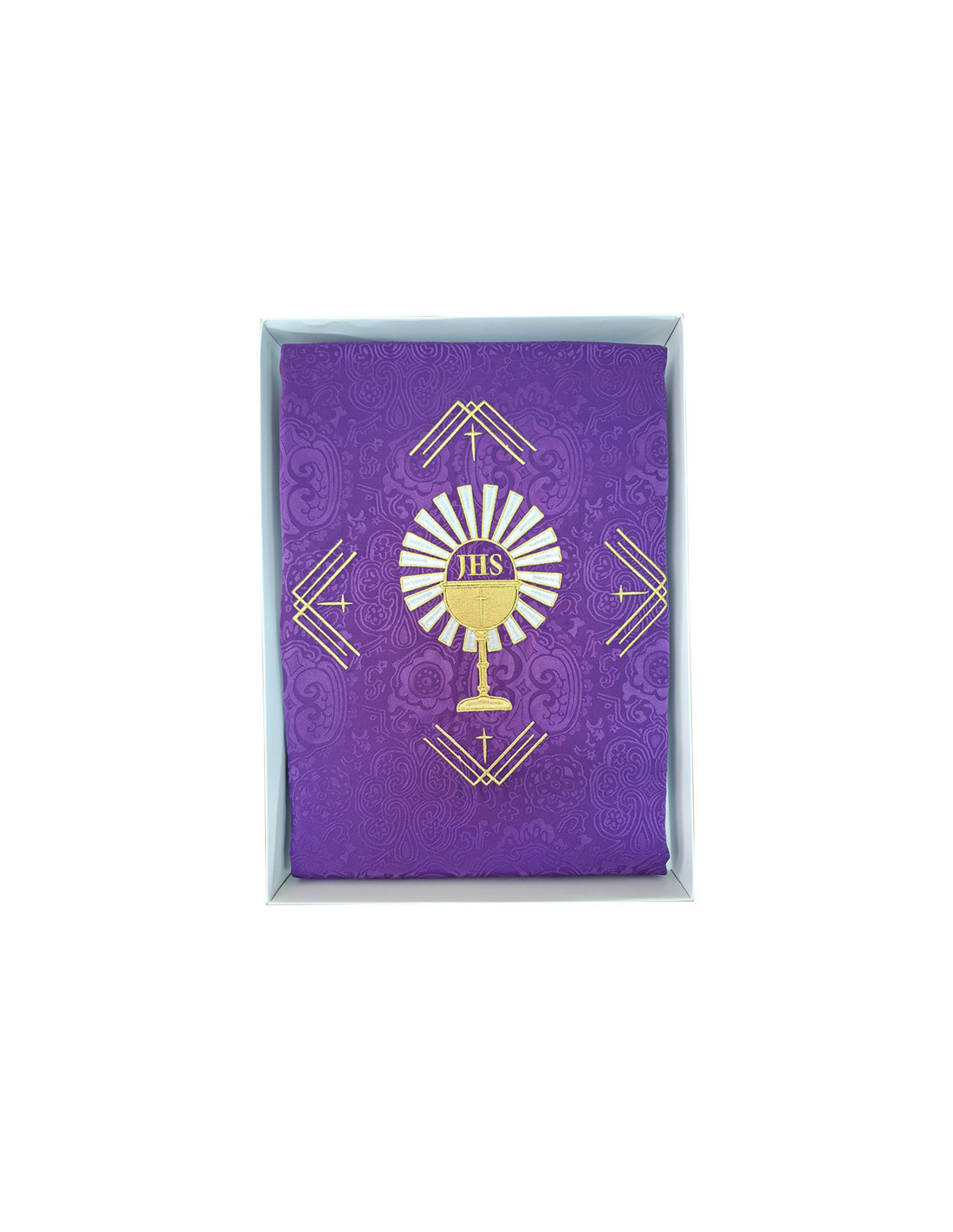 Casulla Adamascada Bordada Caliz Con Forma Jhs Y Rayos Morada