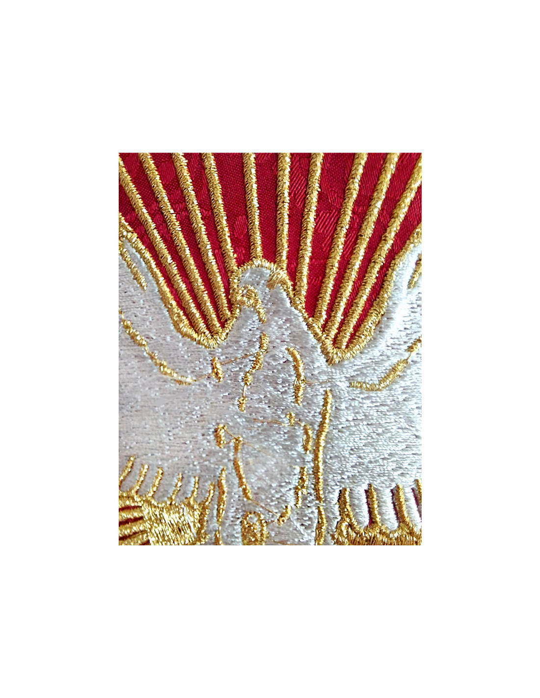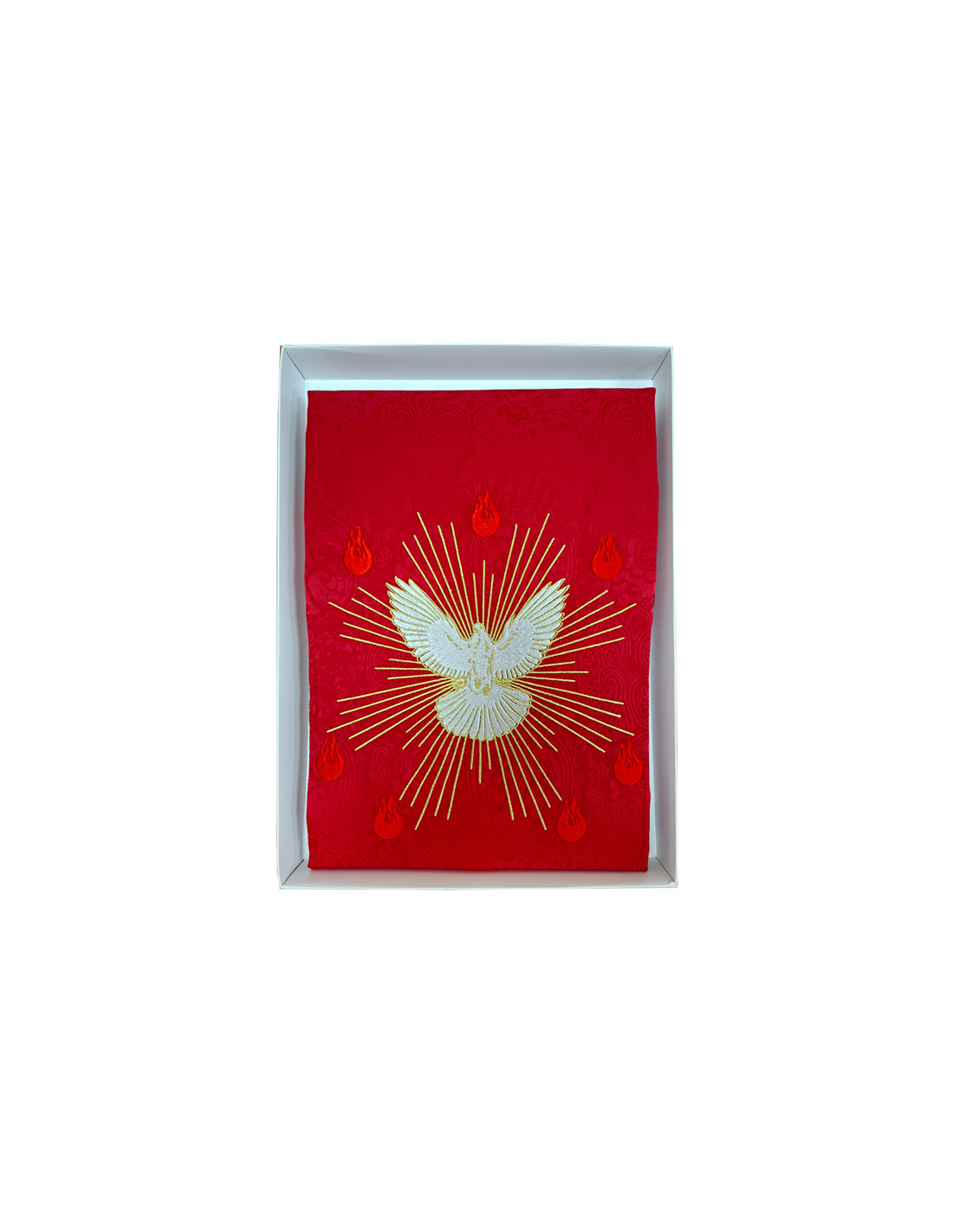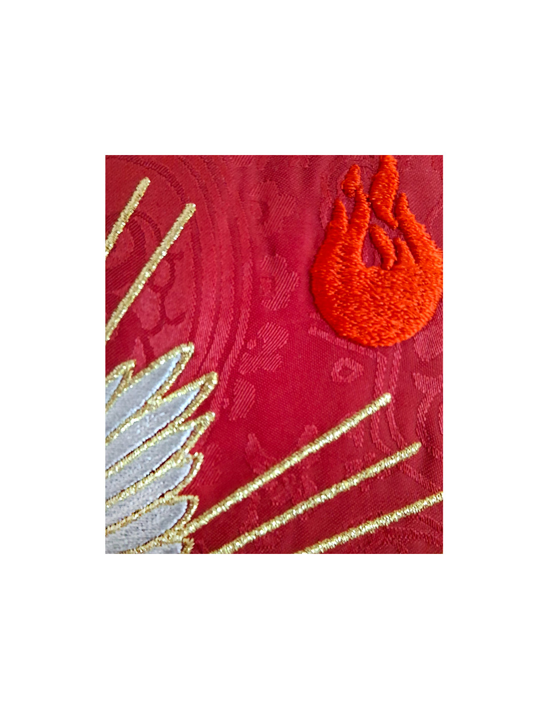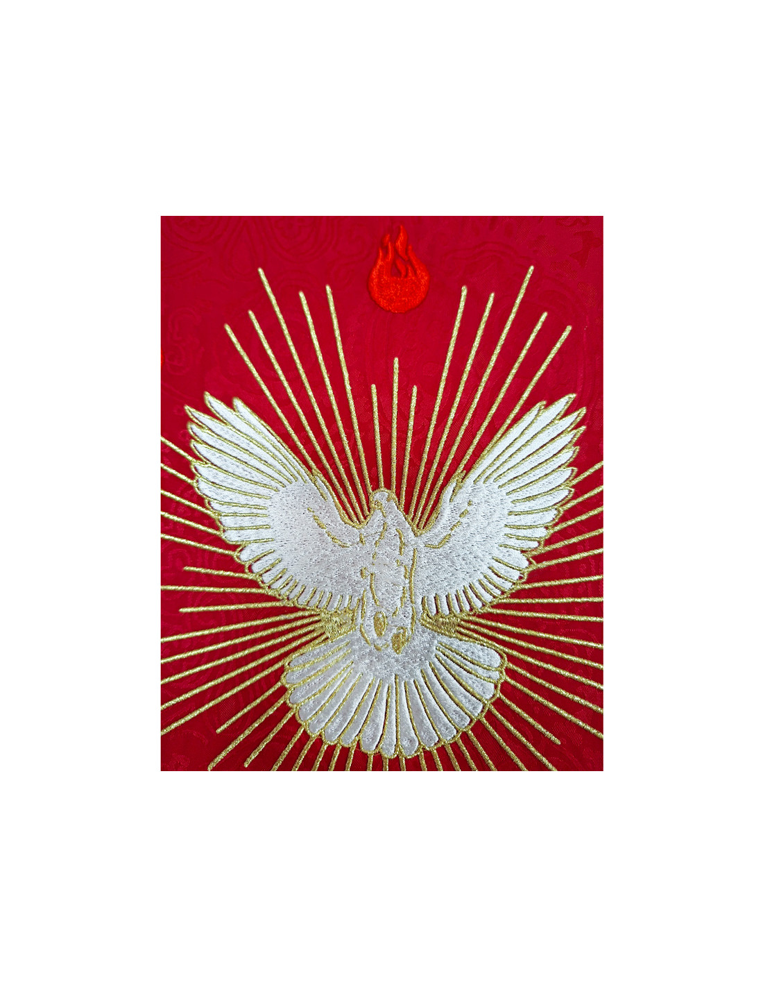 Casulla Adamascada Bordada Espiritu Santo Con Llamas Y Rayos Roja