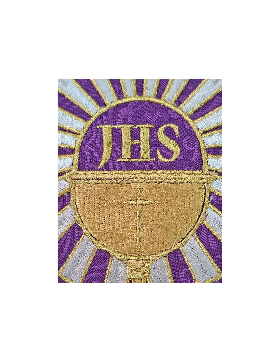 Casulla Adamascada Bordada Caliz Con Forma Jhs Y Rayos Morada