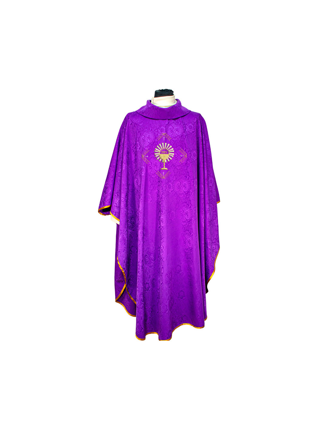 Casulla Adamascada Bordada Caliz Con Forma Jhs Y Rayos Morada