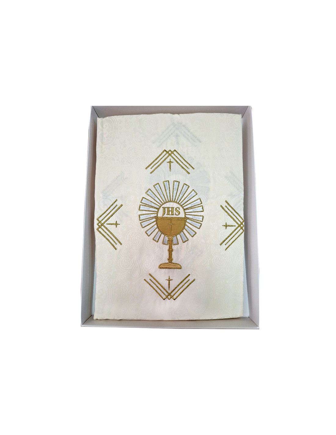 Casulla Adamascada Bordada Caliz Con Forma Jhs Y Rayos Crema