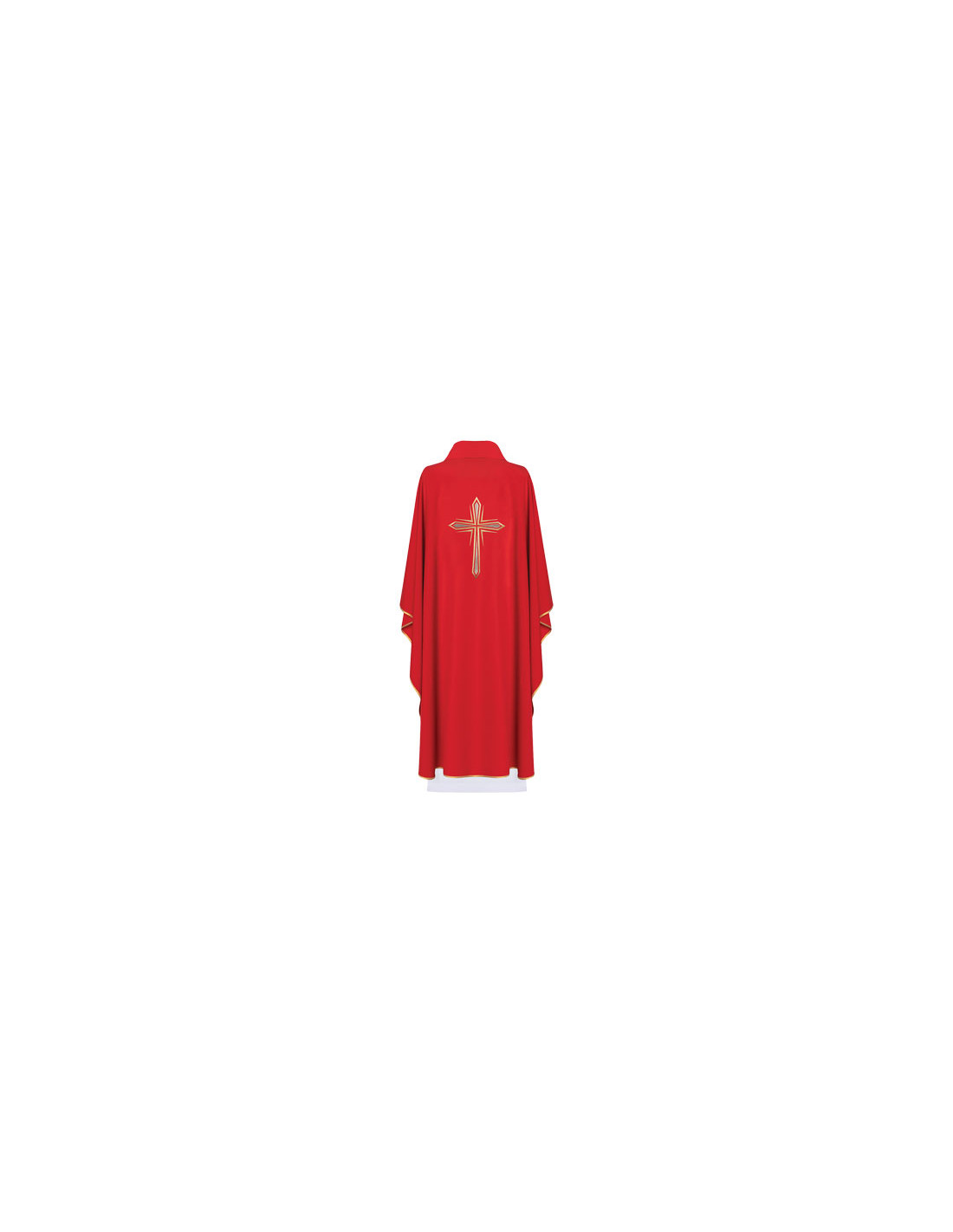 Casulla roja, confeccionada en tejido de alta calidad. Motivo central de Cruz plateada y dorada. Cuello redondo, con estola interior incluida. Últimas unidades. Confeccionada en la UE.