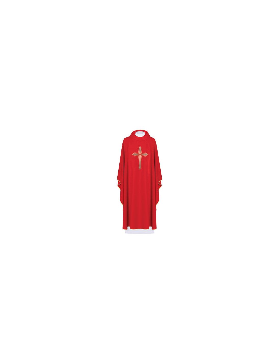 Casulla roja, confeccionada en tejido de alta calidad. Motivo central de Cruz plateada y dorada. Cuello redondo, con estola interior incluida. Últimas unidades. Confeccionada en la UE.