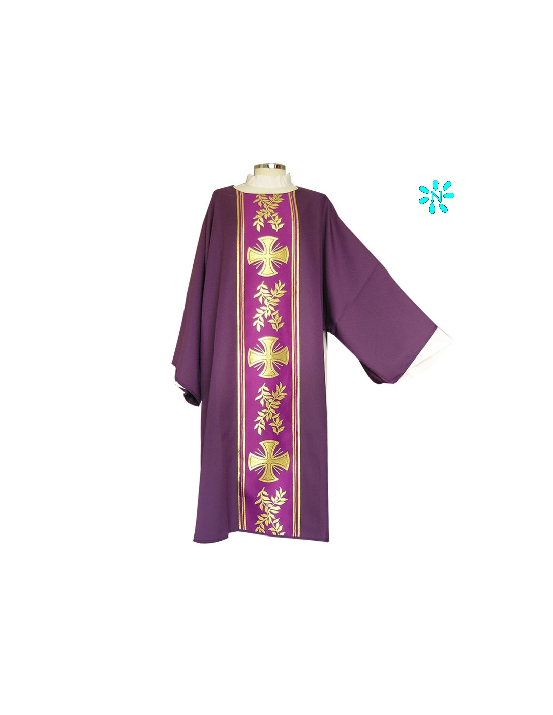 Dalmática morada estampada, confeccionada en tejido liso de alta calidad. Motivo central de cruces con ramas de olivo alternadas. Cuello redondo. Disponible en más colores litúrgicos. Confeccionada en la UE.