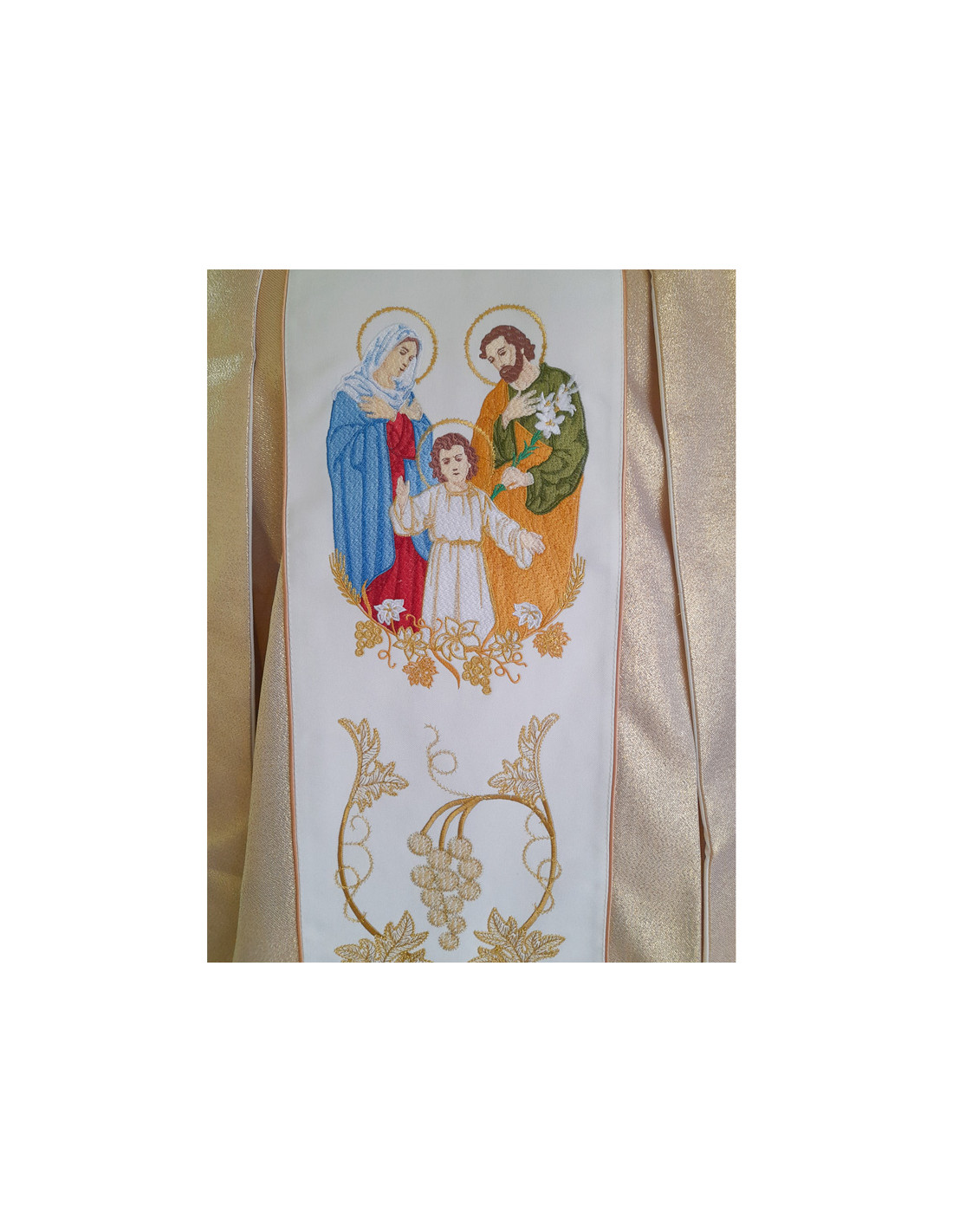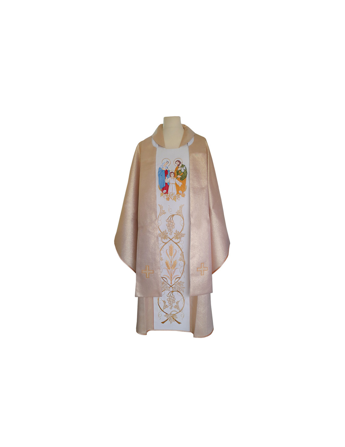 Casulla dorada, confeccionada en tejido de alta calidad. Motivo central de la Sagrada Familia. Cuello abierto a la española, con estola interior incluida. Confeccionada en la UE.
